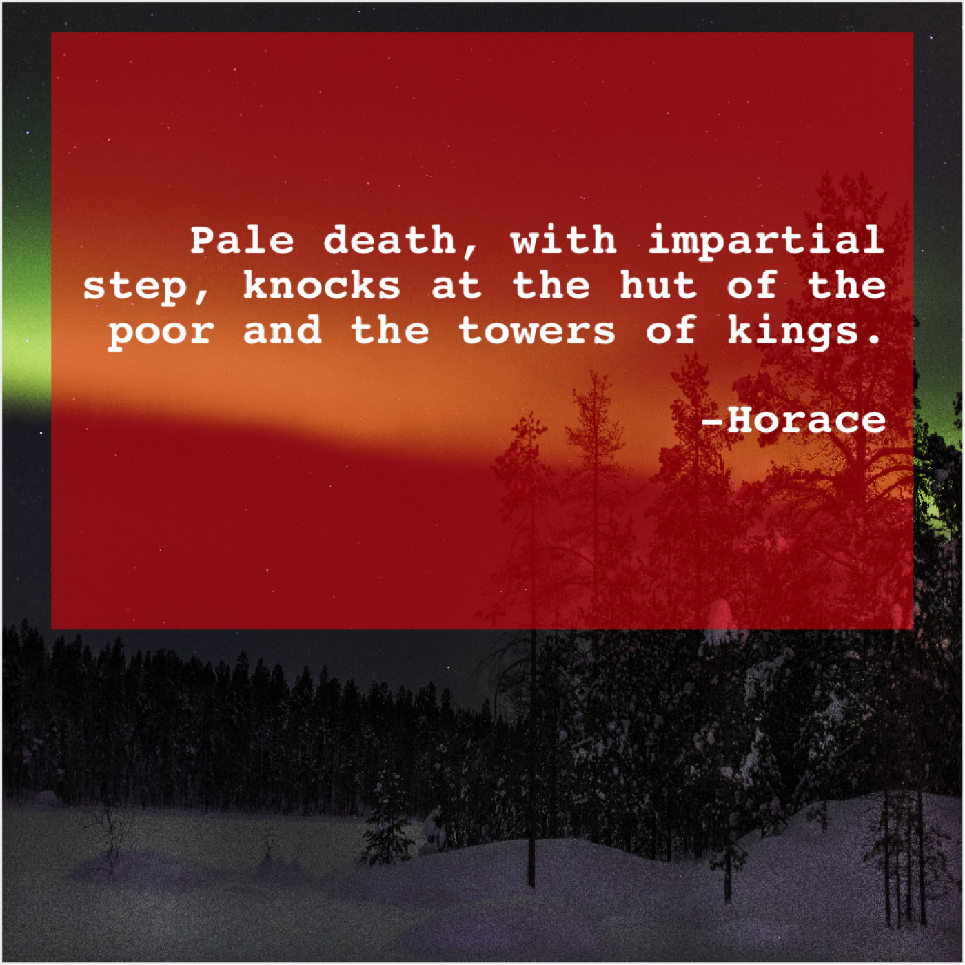 Horace Horace – Pale death, with impartial step… November 15, 2018 admin “Pale death, with impartial step, knocks at the hut of the poor and the towers of kings.”-Horace