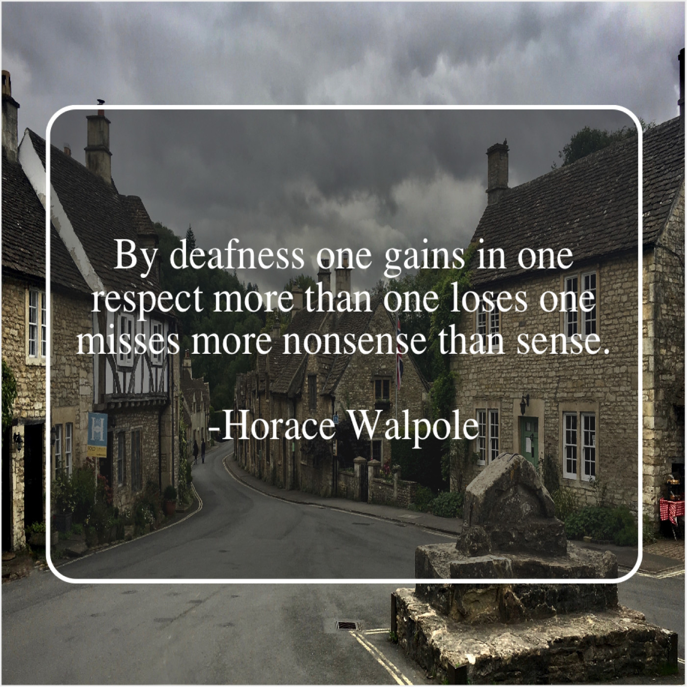 Horace Walpole Horace Walpole – By deafness one gains in… February 26, 2019 admin “By deafness one gains in one respect more than one loses one misses more nonsense than sense.”-Horace Walpole