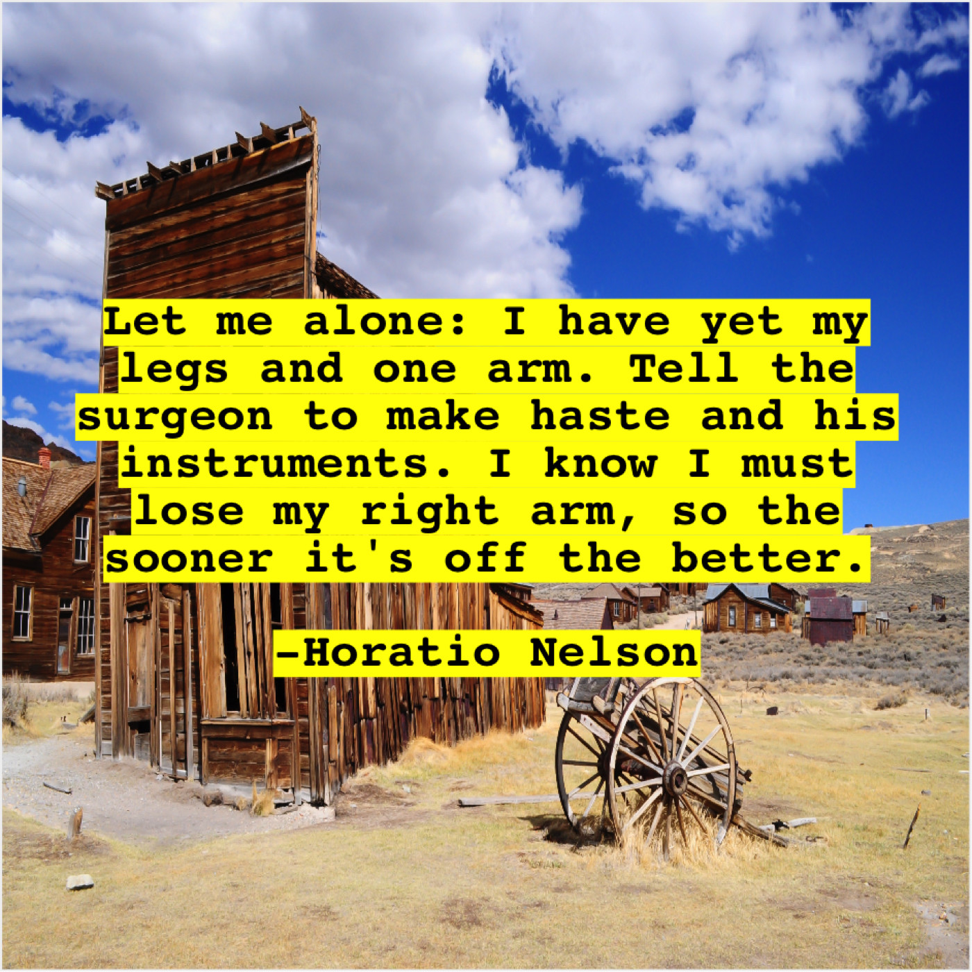 Horatio Nelson Horatio Nelson – Let me alone: I have… March 21, 2019 admin “Let me alone: I have yet my legs and one arm. Tell the surgeon to make haste and his instruments. I know I must lose my right arm, so the sooner it’s off the better.”-Horatio Nelson