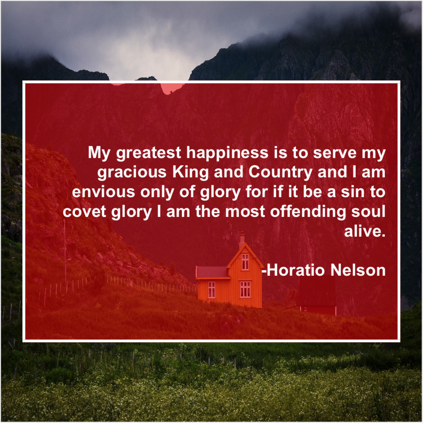 Horatio Nelson Horatio Nelson – My greatest happiness is to… March 6, 2019 admin “My greatest happiness is to serve my gracious King and Country and I am envious only of glory for if it be a sin to covet glory I am the most offending soul alive.”-Horatio Nelson