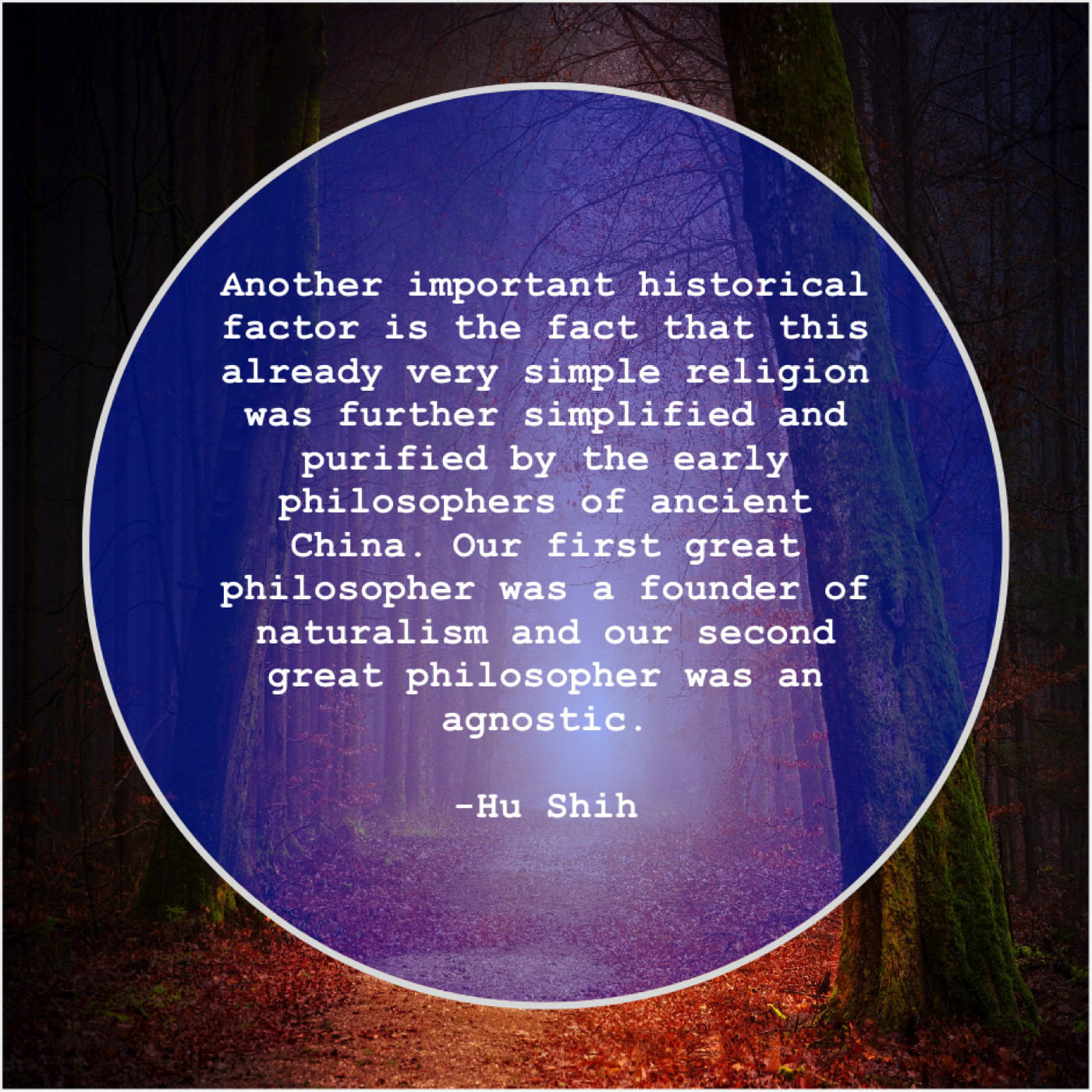 “Another important historical factor is the fact that this already very simple religion was further simplified and purified by the early philosophers of ancient China. Our first great philosopher was a founder of naturalism and our second great philosopher was an agnostic.”