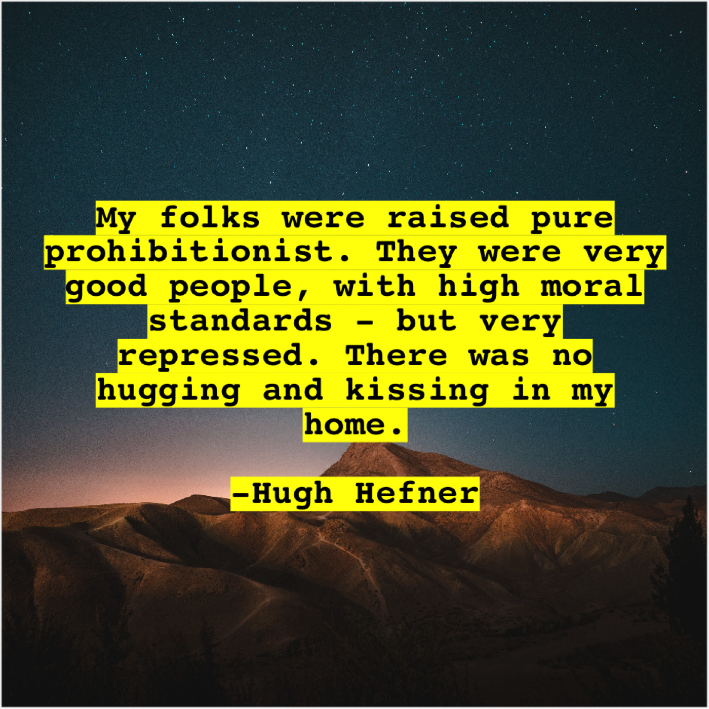 Hugh Hefner Hugh Hefner – My folks were raised pure… April 6, 2019 admin “My folks were raised pure prohibitionist. They were very good people, with high moral standards – but very repressed. There was no hugging and kissing in my home.”-Hugh Hefner