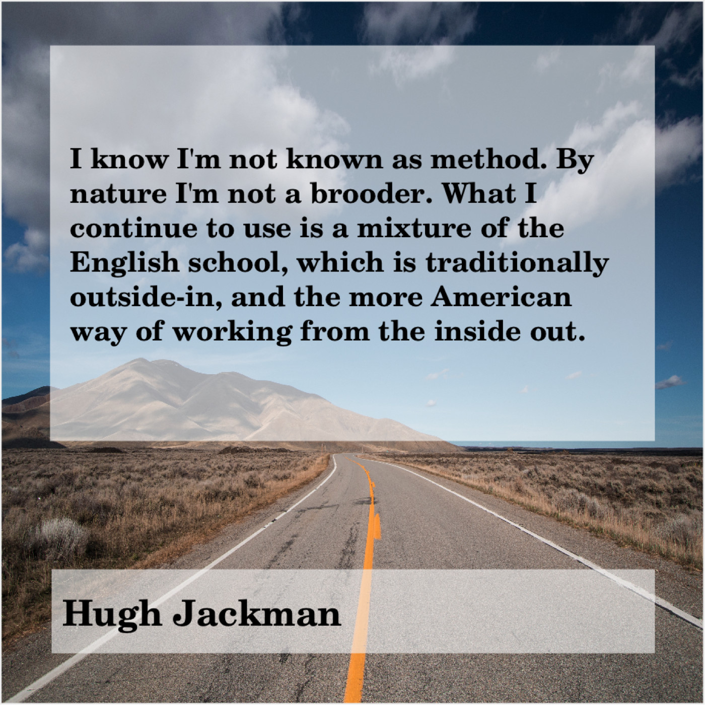 Hugh Jackman Hugh Jackman – I know I’m not known… January 29, 2019 admin “I know I’m not known as method. By nature I’m not a brooder. What I continue to use is a mixture of the English school, which is traditionally outside-in, and the more American way of working from the inside out.”-Hugh Jackman