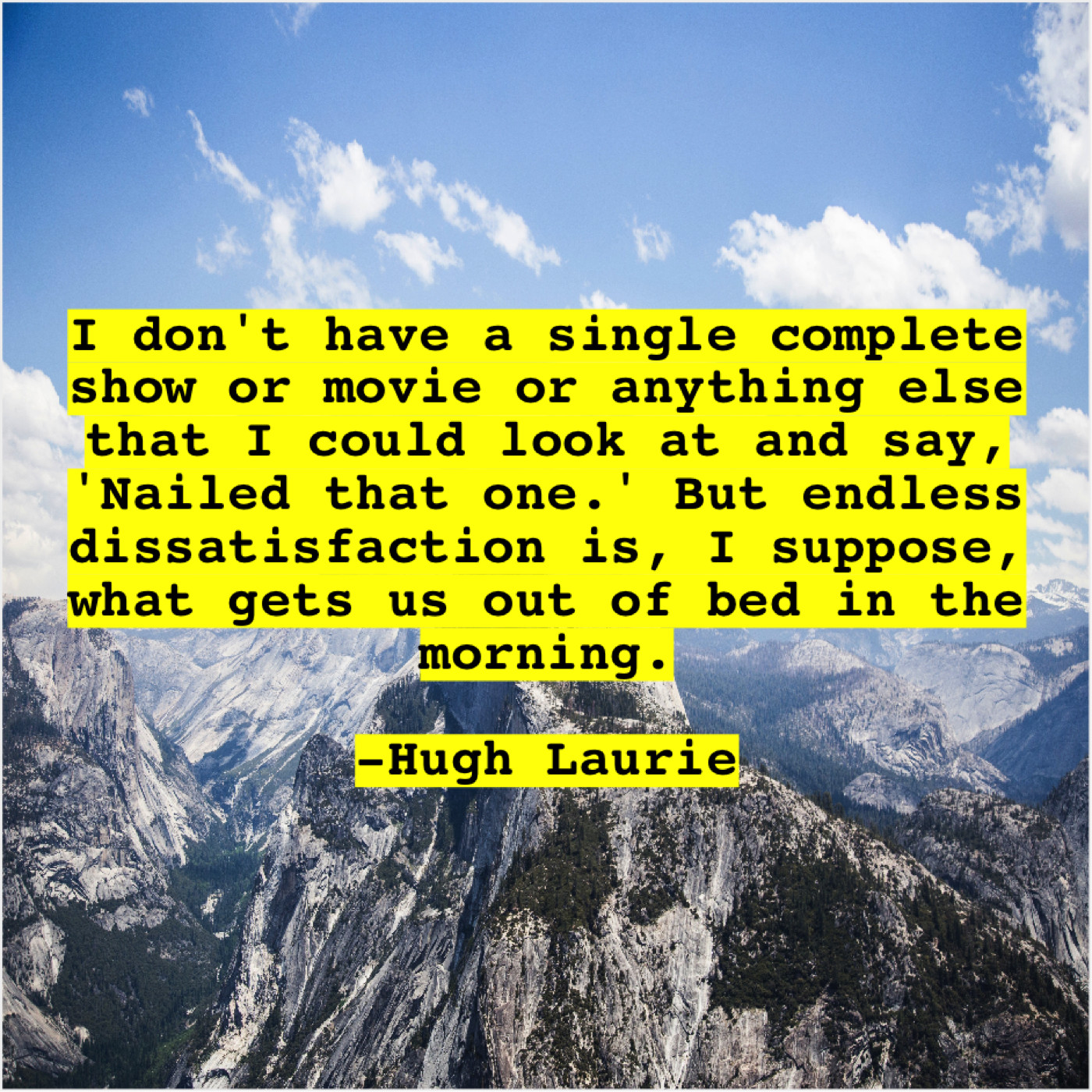 Hugh Laurie Hugh Laurie – I don’t have a single… June 18, 2019 admin “I don’t have a single complete show or movie or anything else that I could look at and say, ‘Nailed that one.’ But endless dissatisfaction is, I suppose, what gets us out of bed in the morning.”-Hugh Laurie