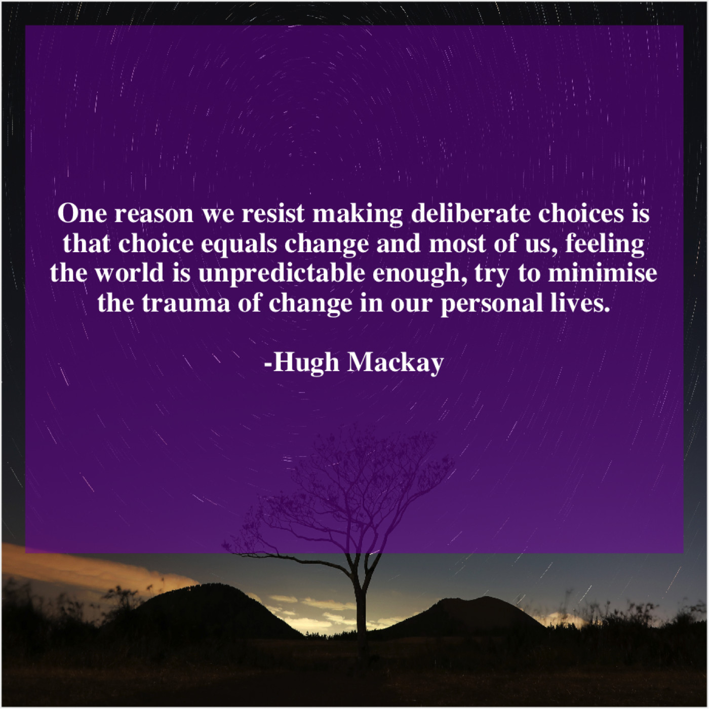 Hugh Mackay Hugh Mackay – One reason we resist making… June 20, 2019 admin “One reason we resist making deliberate choices is that choice equals change and most of us, feeling the world is unpredictable enough, try to minimise the trauma of change in our personal lives.”-Hugh Mackay