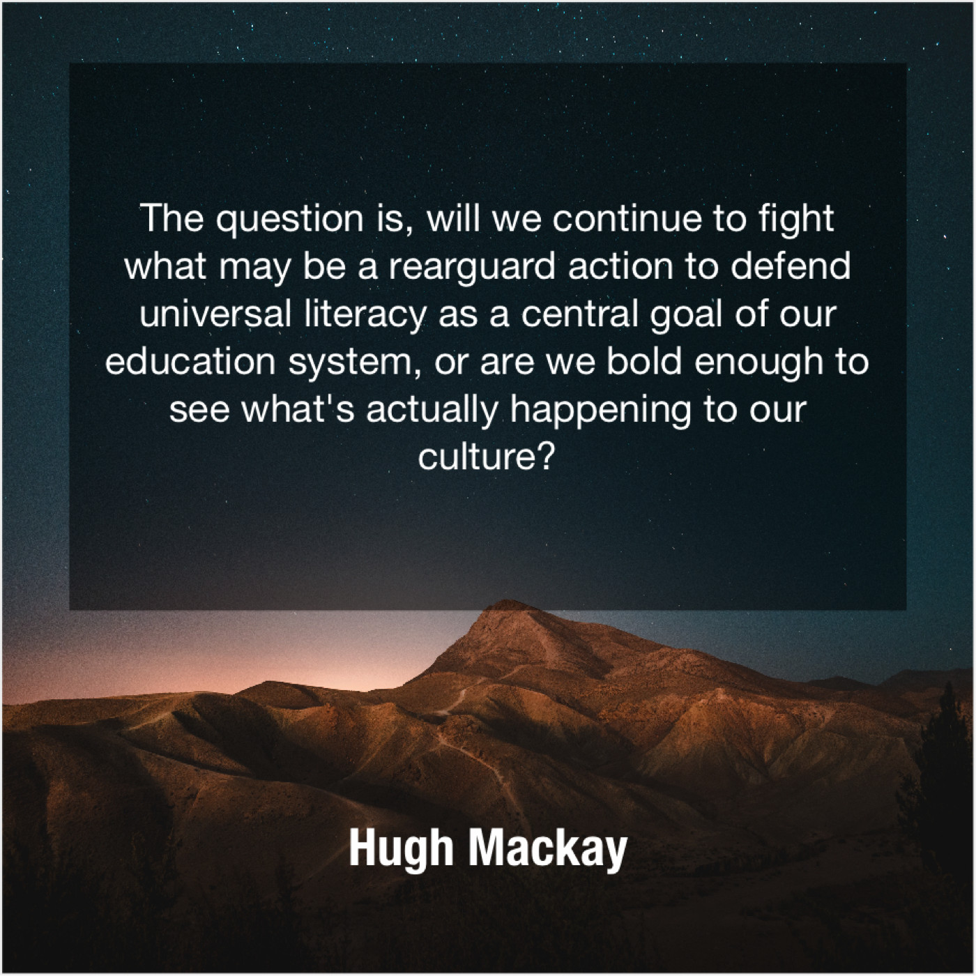 Hugh Mackay Hugh Mackay – The question is, will we… May 6, 2019 admin “The question is, will we continue to fight what may be a rearguard action to defend universal literacy as a central goal of our education system, or are we bold enough to see what’s actually happening to our culture?”-Hugh Mackay