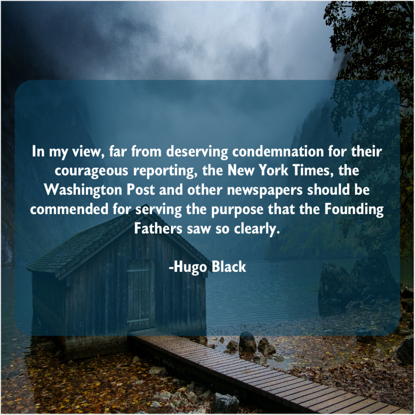 Hugo Black Hugo Black – In my view, far from… August 2, 2019 admin “In my view, far from deserving condemnation for their courageous reporting, the New York Times, the Washington Post and other newspapers should be commended for serving the purpose that the Founding Fathers saw so clearly.”-Hugo Black