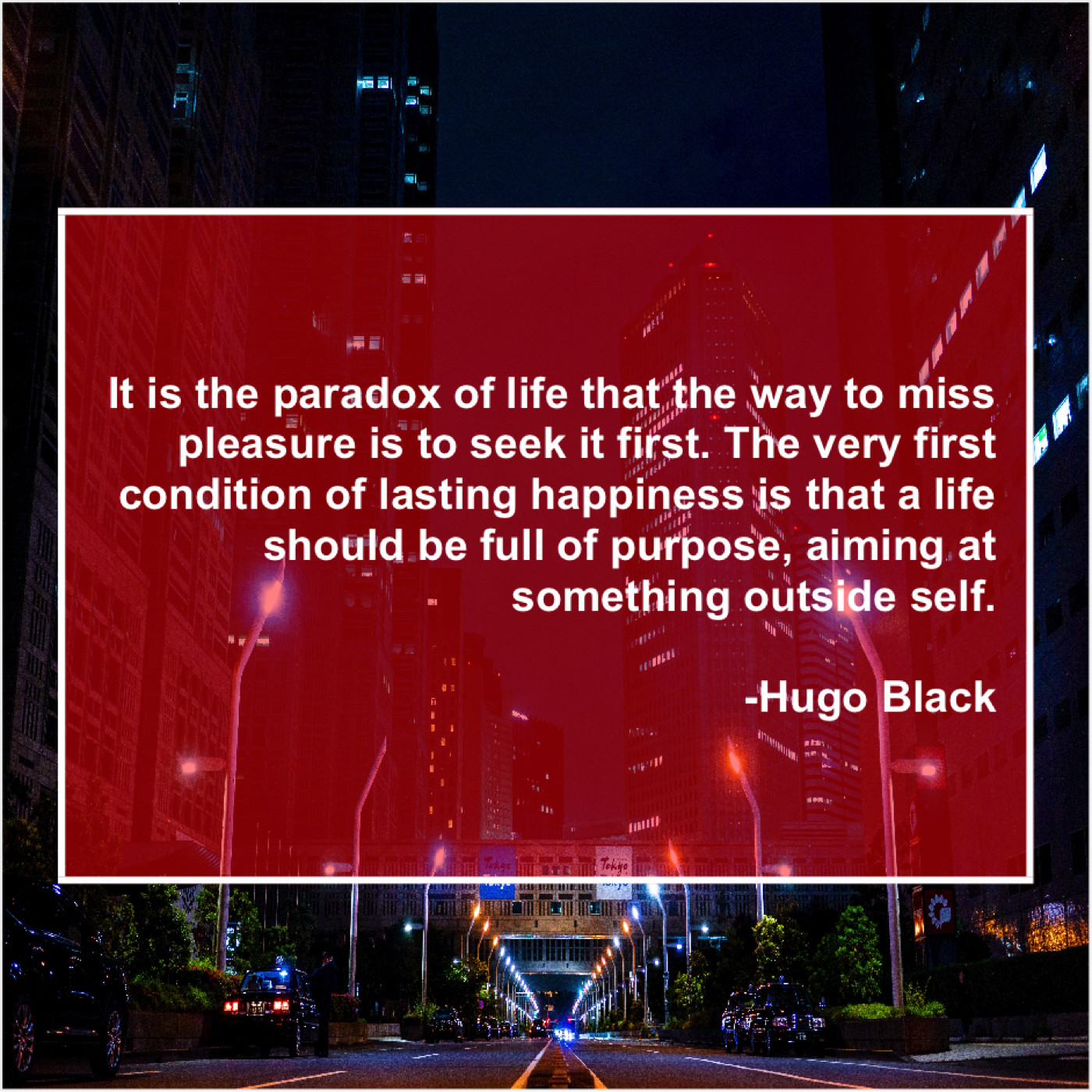 “It is the paradox of life that the way to miss pleasure is to seek it first. The very first condition of lasting happiness is that a life should be full of purpose, aiming at something outside self.”
