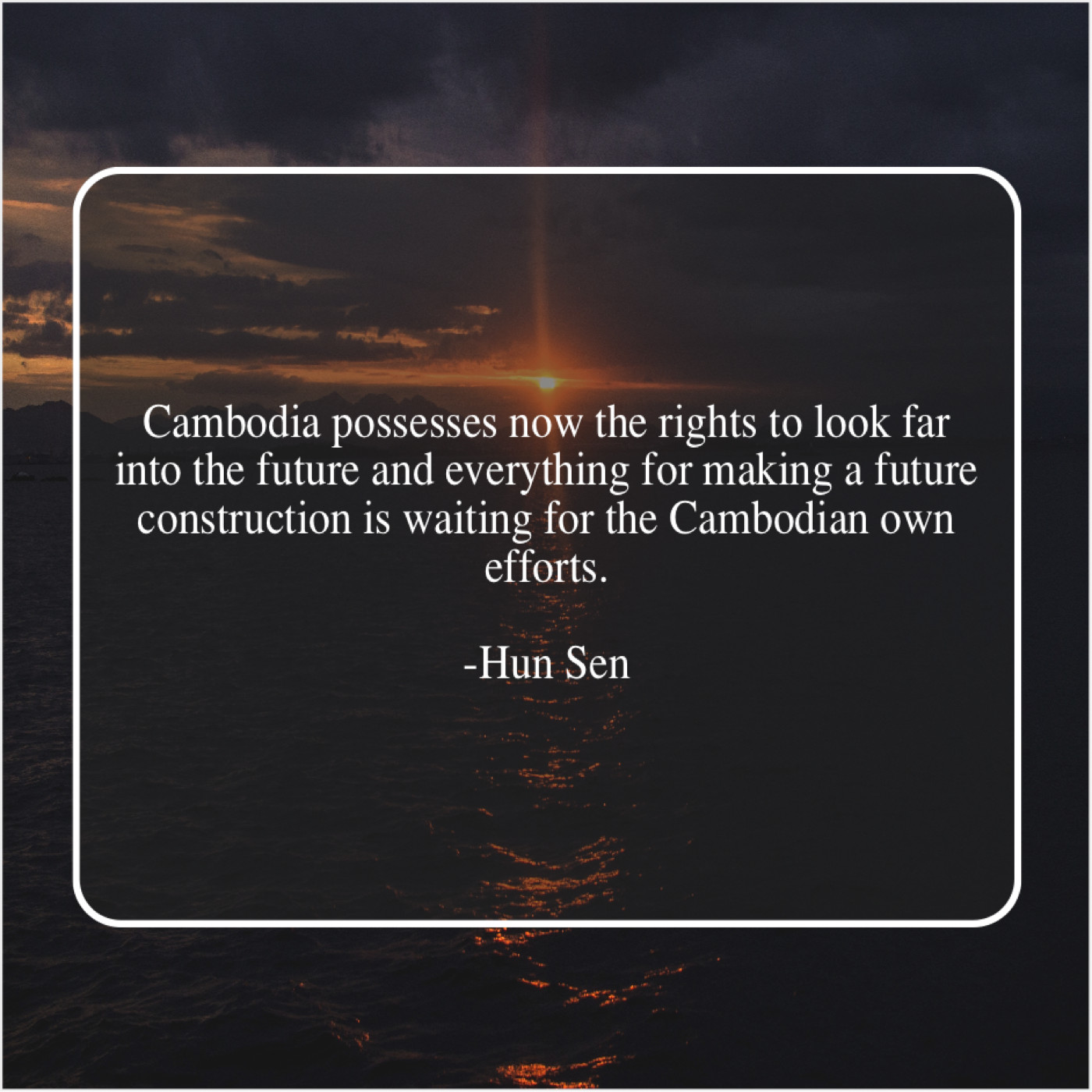 Hun Sen Hun Sen – Cambodia possesses now the rights… October 15, 2019 admin “Cambodia possesses now the rights to look far into the future and everything for making a future construction is waiting for the Cambodian own efforts.”-Hun Sen