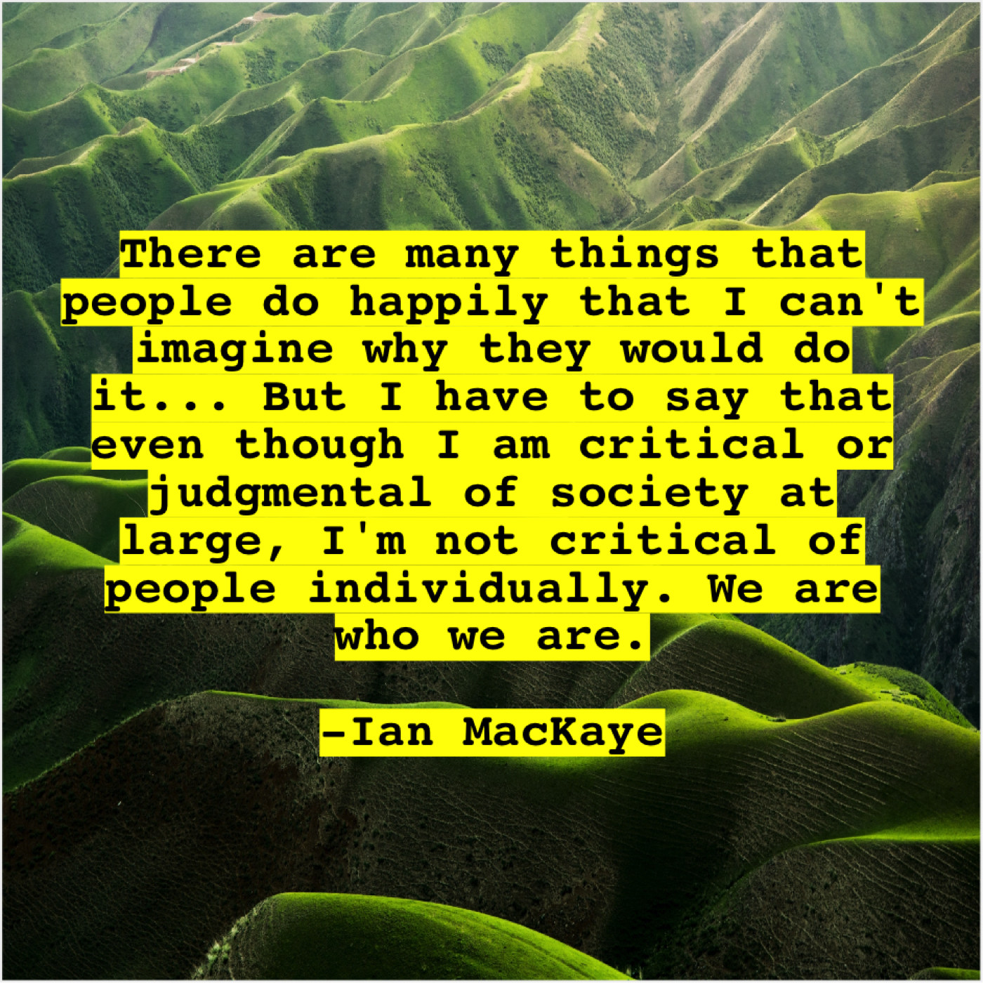 Ian MacKaye Ian MacKaye – There are many things that… January 14, 2019 admin “There are many things that people do happily that I can’t imagine why they would do it… But I have to say that even though I am critical or judgmental of society at large, I’m not critical of people individually. We are who we are.”-Ian MacKaye