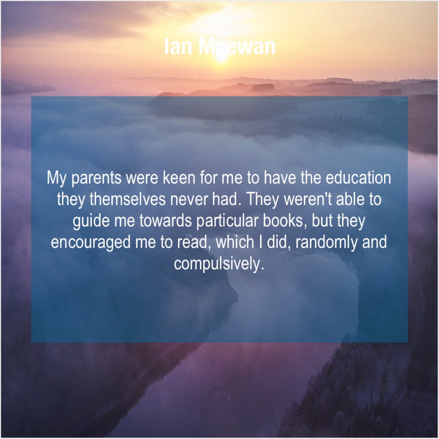 Ian Mcewan Ian Mcewan – My parents were keen for… October 21, 2019 admin “My parents were keen for me to have the education they themselves never had. They weren’t able to guide me towards particular books, but they encouraged me to read, which I did, randomly and compulsively.”-Ian Mcewan