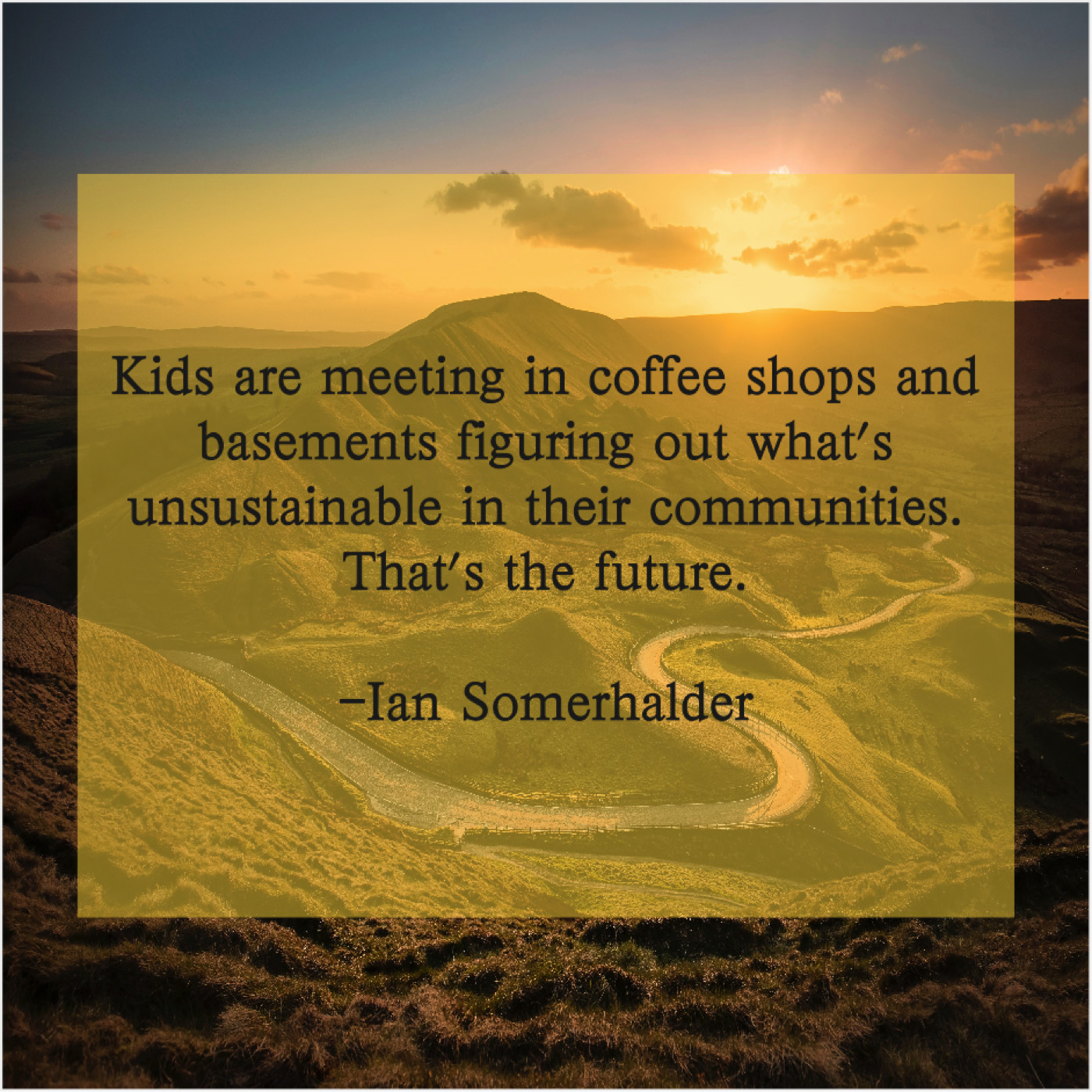 Ian Somerhalder Ian Somerhalder – Kids are meeting in coffee… October 14, 2019 admin “Kids are meeting in coffee shops and basements figuring out what’s unsustainable in their communities. That’s the future.”-Ian Somerhalder
