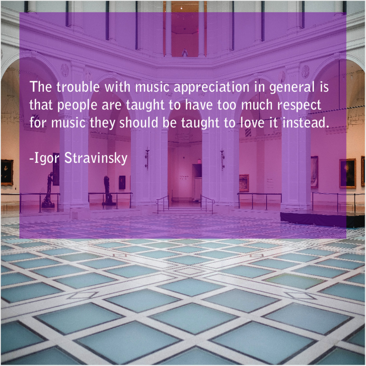 Igor Stravinsky Igor Stravinsky – The trouble with music appreciation… July 6, 2019 admin “The trouble with music appreciation in general is that people are taught to have too much respect for music they should be taught to love it instead.”-Igor Stravinsky