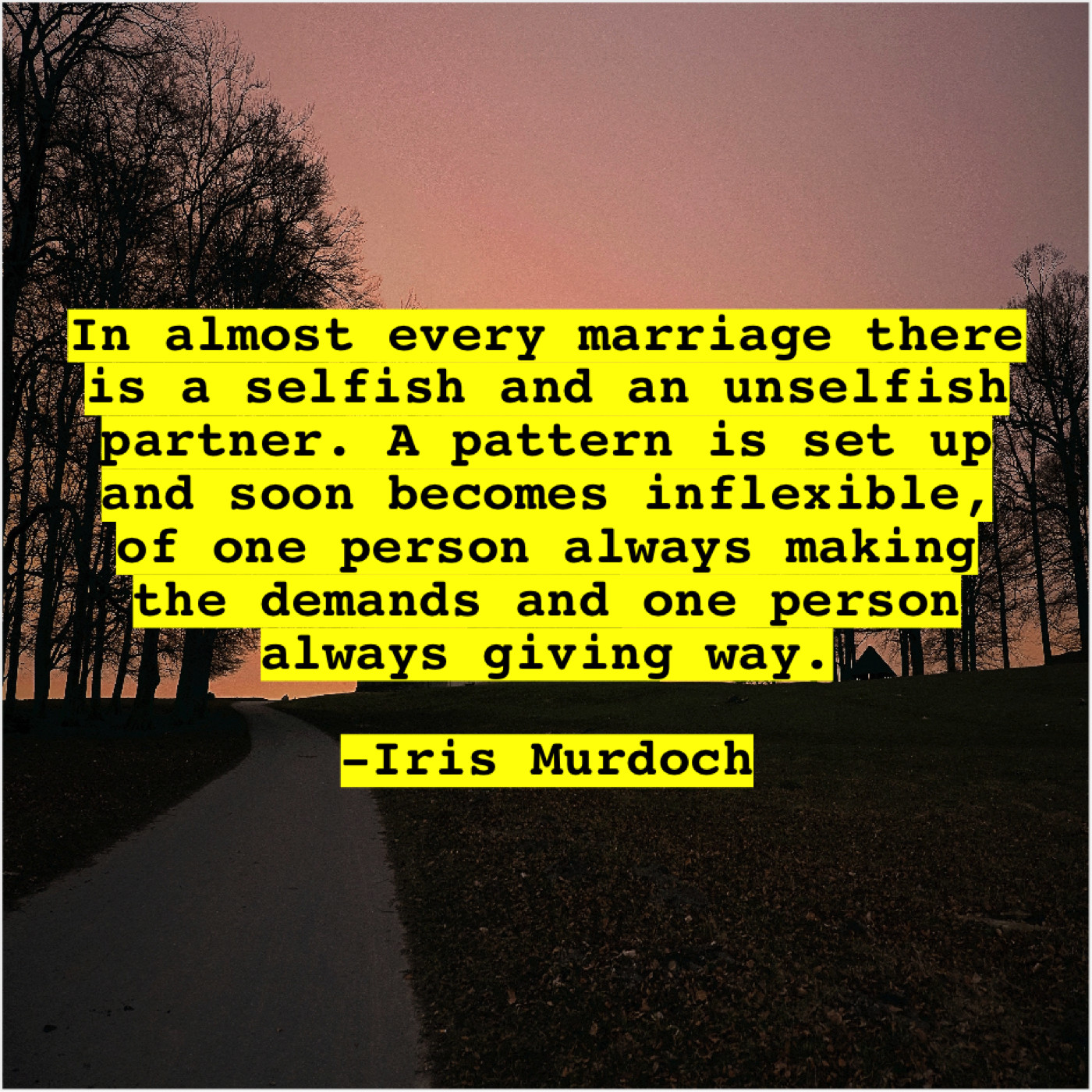 Iris Murdoch Iris Murdoch – In almost every marriage there… March 11, 2019 admin “In almost every marriage there is a selfish and an unselfish partner. A pattern is set up and soon becomes inflexible, of one person always making the demands and one person always giving way.”-Iris Murdoch