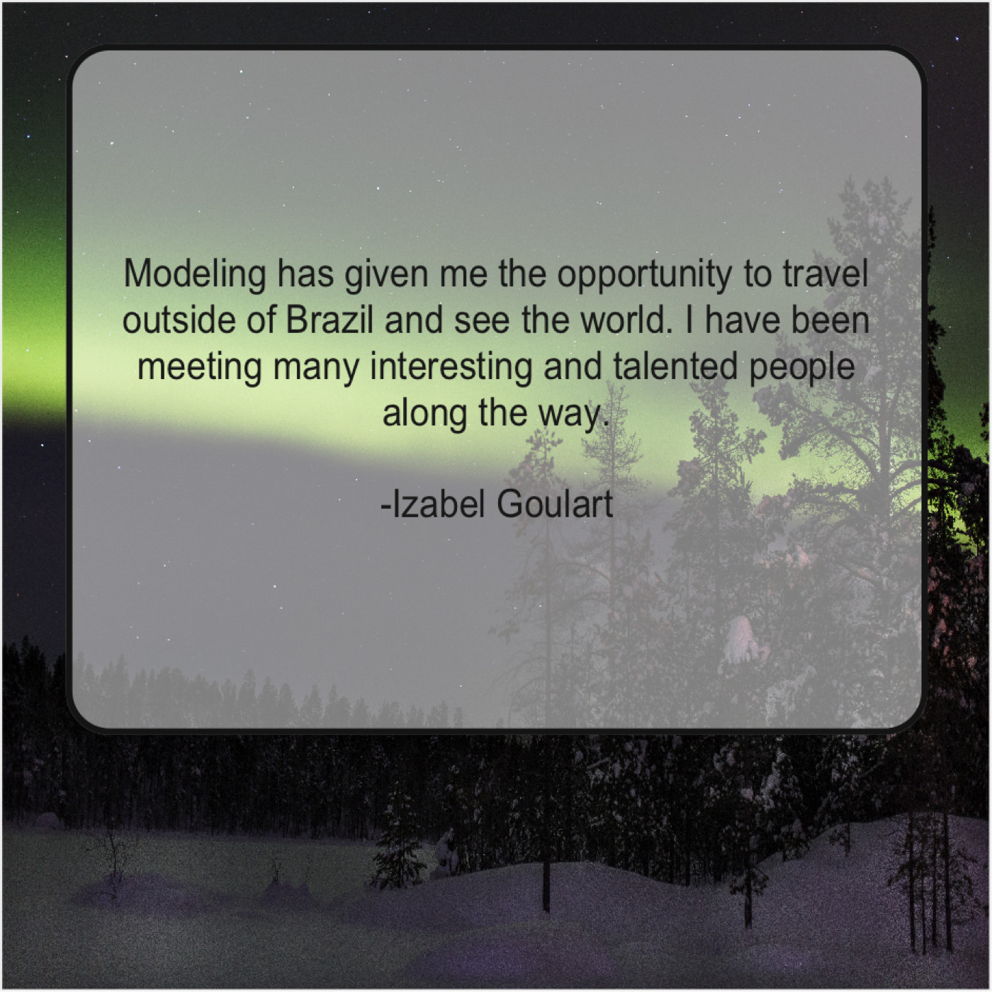 Izabel Goulart Izabel Goulart – Modeling has given me the… July 5, 2019 admin “Modeling has given me the opportunity to travel outside of Brazil and see the world. I have been meeting many interesting and talented people along the way.”-Izabel Goulart