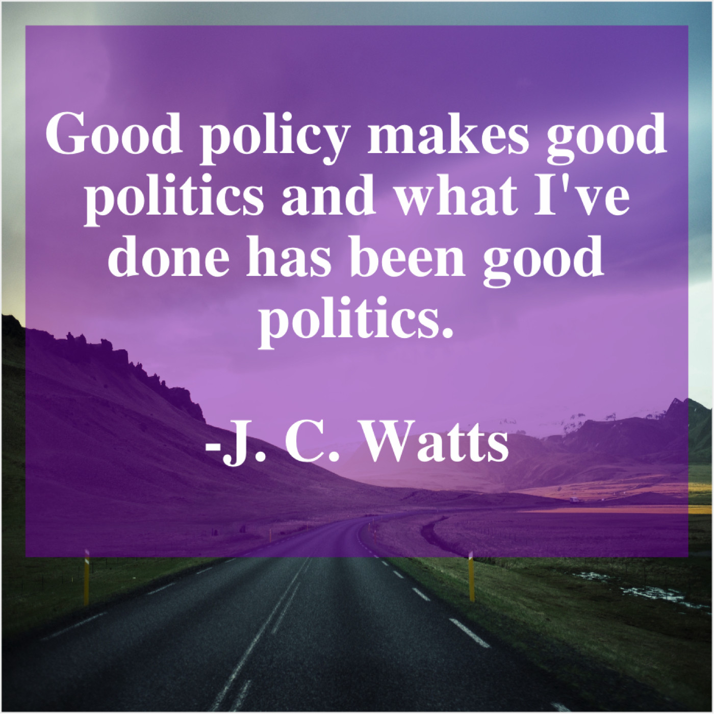 J. C. Watts J. C. Watts – Good policy makes good politics… August 8, 2019 admin “Good policy makes good politics and what I’ve done has been good politics.”-J. C. Watts