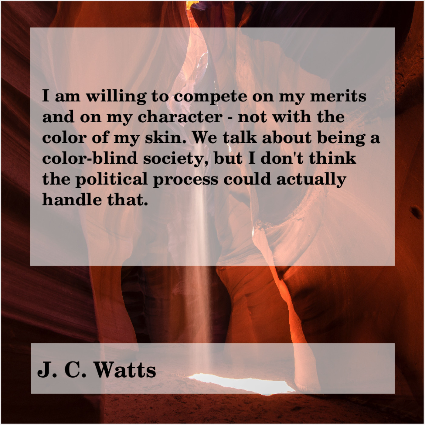 J. C. Watts J. C. Watts – I am willing to compete… July 27, 2019 admin “I am willing to compete on my merits and on my character – not with the color of my skin. We talk about being a color-blind society, but I don’t think the political process could actually handle that.”-J. C. Watts