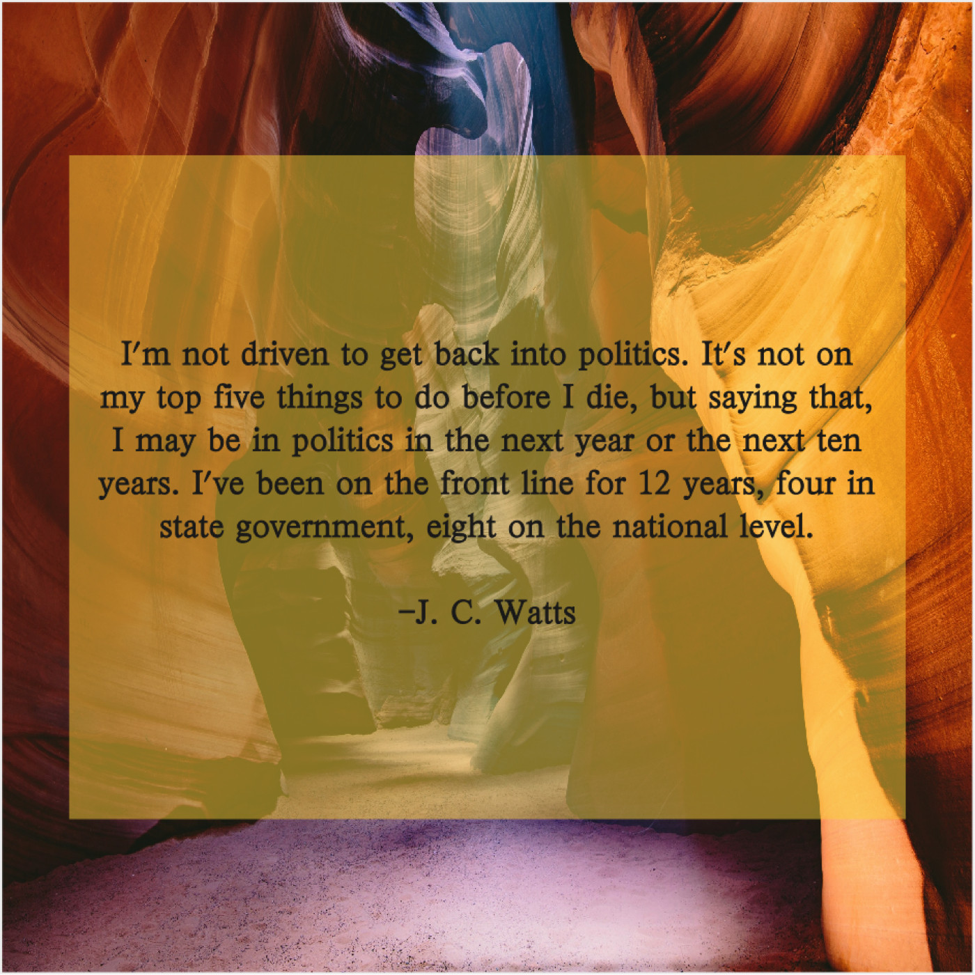 “I’m not driven to get back into politics. It’s not on my top five things to do before I die, but saying that, I may be in politics in the next year or the next ten years. I’ve been on the front line for 12 years, four in state government, eight on the national level.”