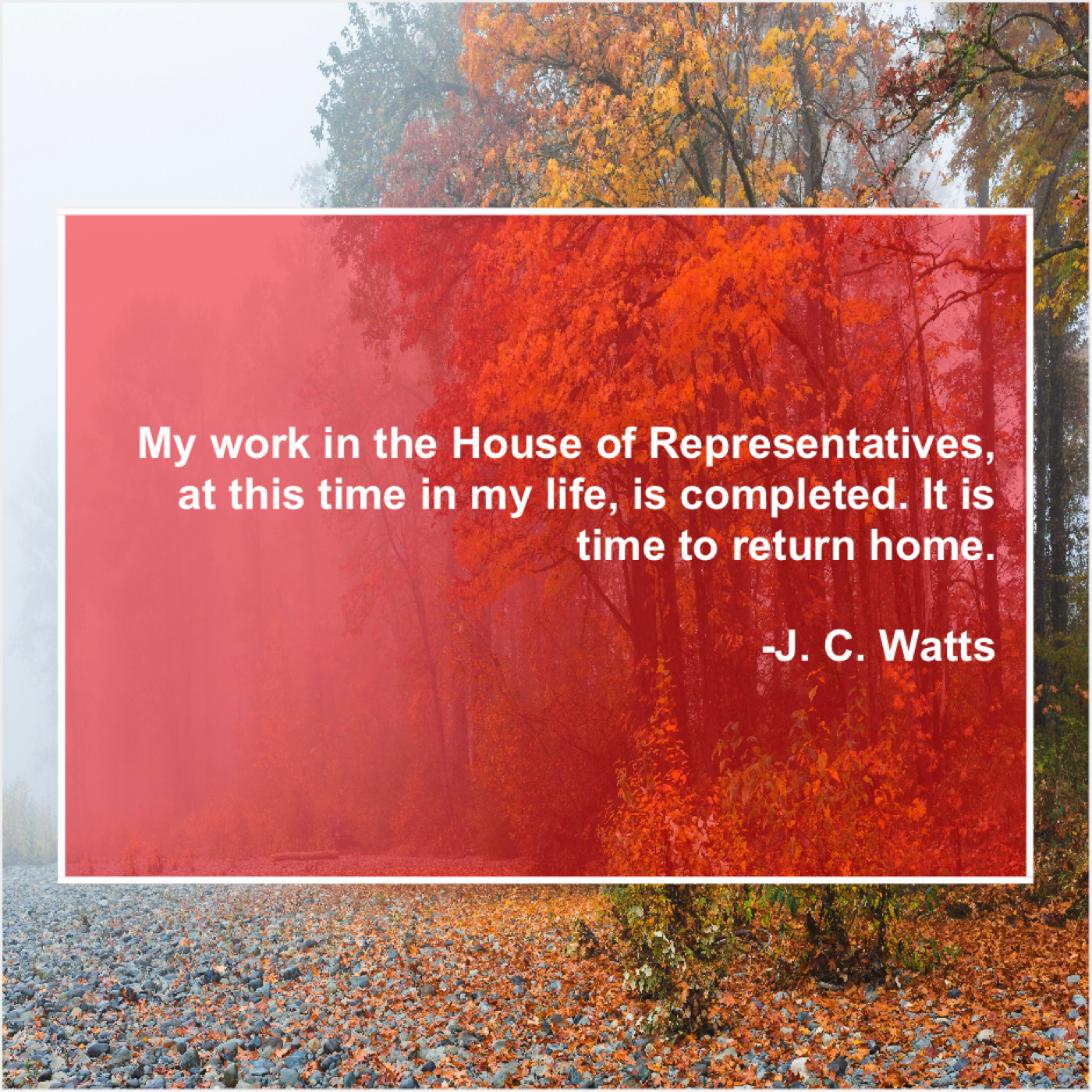 J. C. Watts J. C. Watts – My work in the House… May 30, 2019 admin “My work in the House of Representatives, at this time in my life, is completed. It is time to return home.”-J. C. Watts