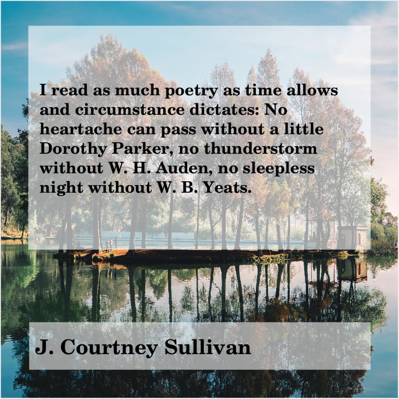 J. Courtney Sullivan J. Courtney Sullivan – I read as much poetry… August 23, 2019 admin “I read as much poetry as time allows and circumstance dictates: No heartache can pass without a little Dorothy Parker, no thunderstorm without W. H. Auden, no sleepless night without W. B. Yeats.”-J. Courtney Sullivan