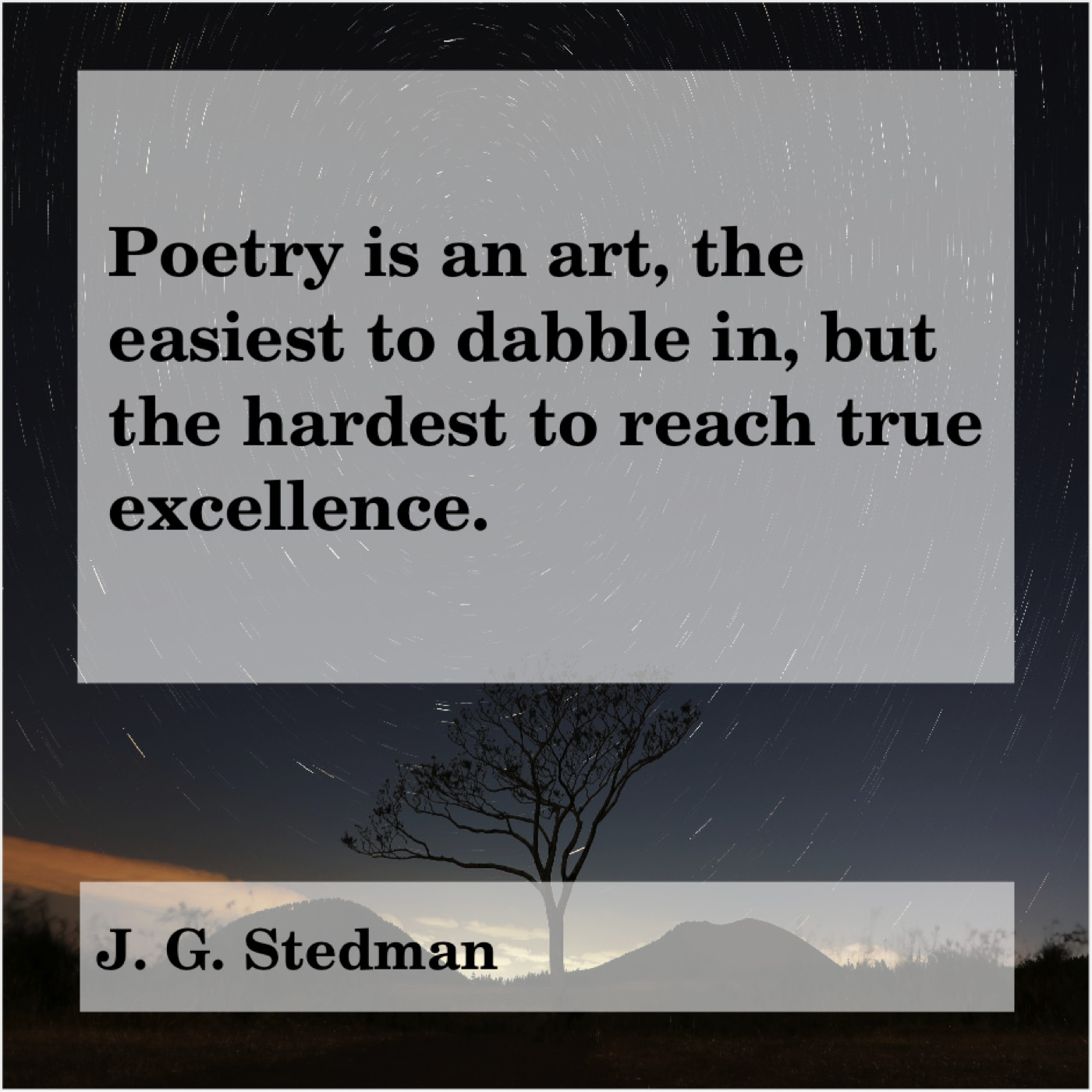J. G. Stedman J. G. Stedman – Poetry is an art, the… October 23, 2019 admin “Poetry is an art, the easiest to dabble in, but the hardest to reach true excellence.”-J. G. Stedman