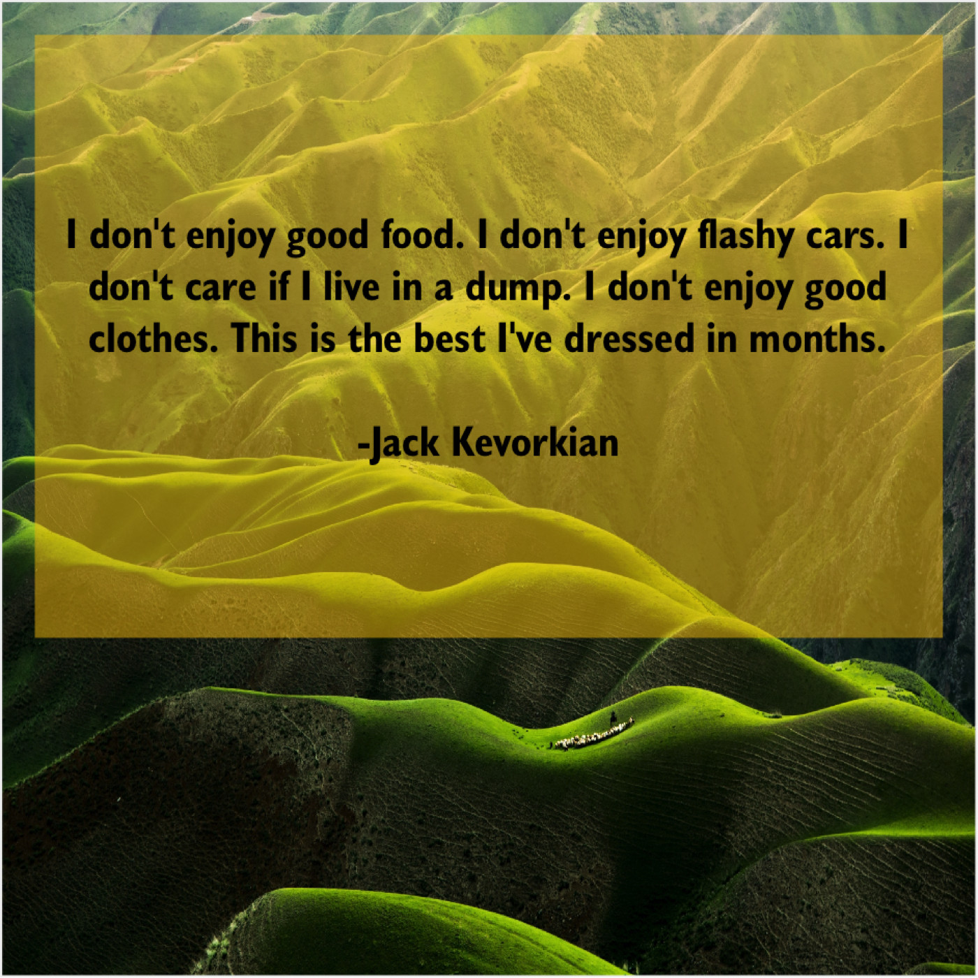 Jack Kevorkian Jack Kevorkian – I don’t enjoy good food… July 6, 2019 admin “I don’t enjoy good food. I don’t enjoy flashy cars. I don’t care if I live in a dump. I don’t enjoy good clothes. This is the best I’ve dressed in months.”-Jack Kevorkian