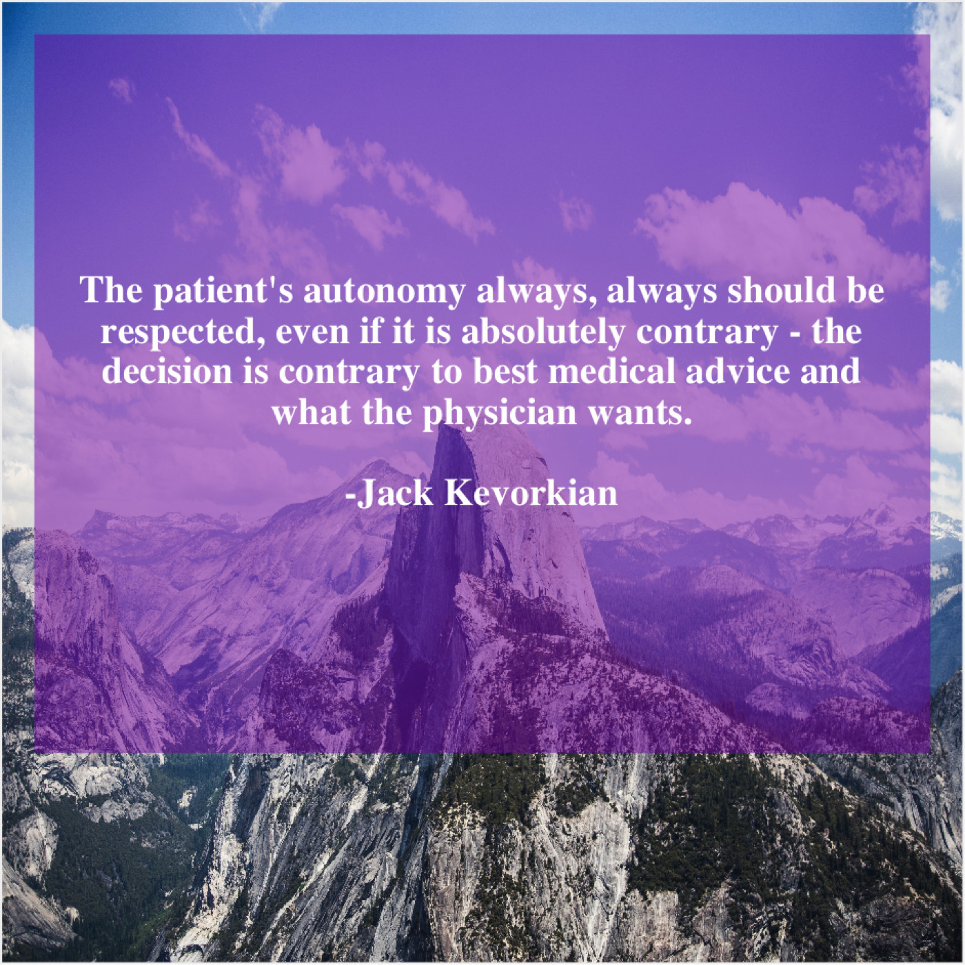 Jack Kevorkian Jack Kevorkian – The patient’s autonomy always, always… November 30, 2018 admin “The patient’s autonomy always, always should be respected, even if it is absolutely contrary – the decision is contrary to best medical advice and what the physician wants.”-Jack Kevorkian