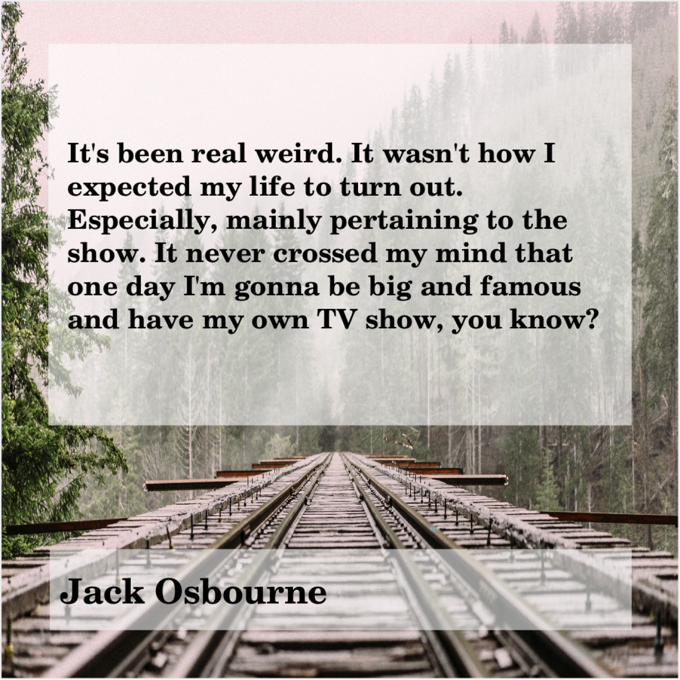 Jack Osbourne Jack Osbourne – It’s been real weird. It… December 23, 2018 admin “It’s been real weird. It wasn’t how I expected my life to turn out. Especially, mainly pertaining to the show. It never crossed my mind that one day I’m gonna be big and famous and have my own TV show, you know?”-Jack Osbourne