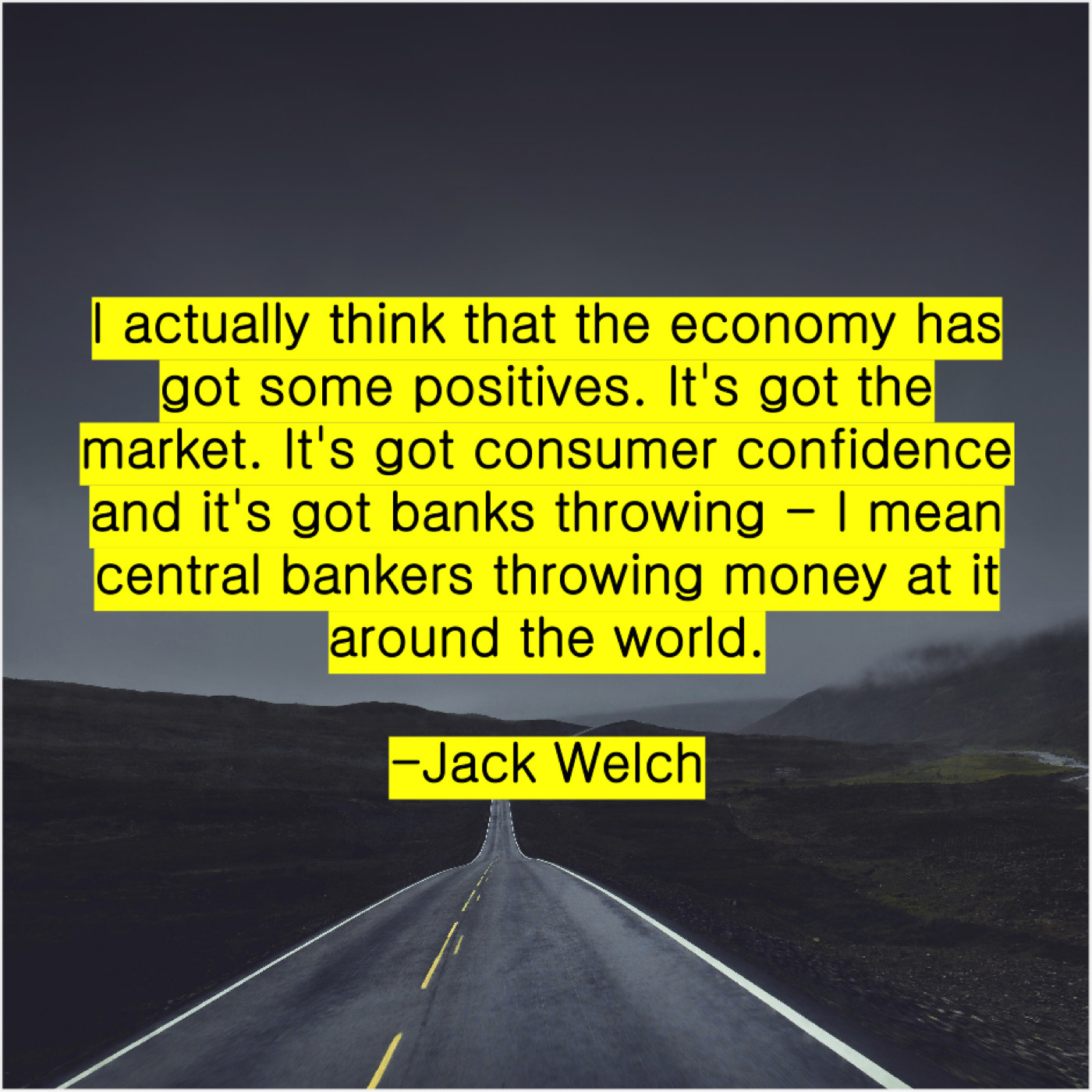 Jack Welch Jack Welch – I actually think that the… March 20, 2019 admin “I actually think that the economy has got some positives. It’s got the market. It’s got consumer confidence and it’s got banks throwing – I mean central bankers throwing money at it around the world.”-Jack Welch