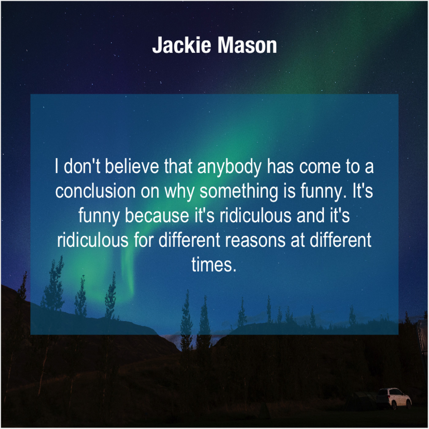 Jackie Mason Jackie Mason – I don’t believe that anybody… February 2, 2019 admin “I don’t believe that anybody has come to a conclusion on why something is funny. It’s funny because it’s ridiculous and it’s ridiculous for different reasons at different times.”-Jackie Mason
