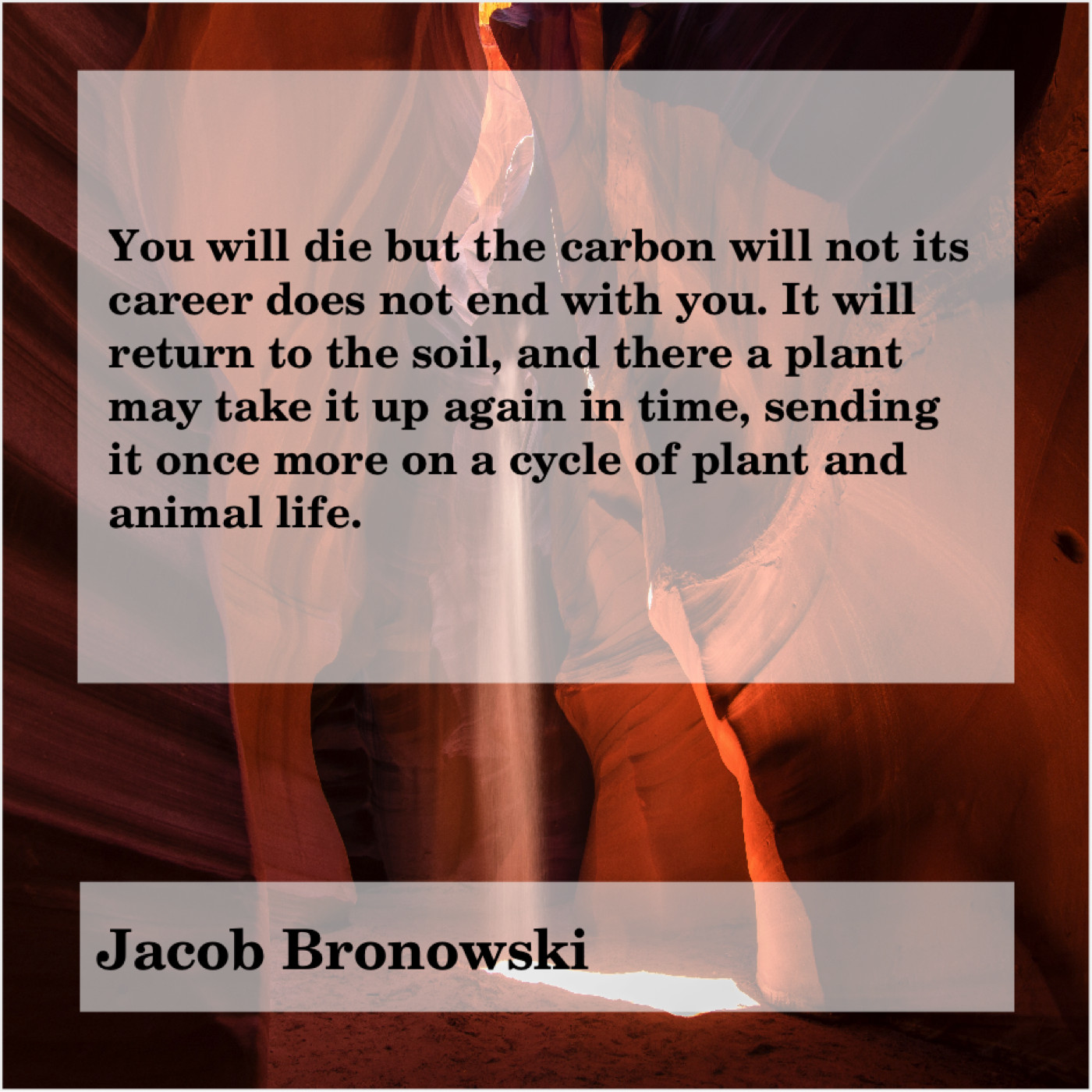 Jacob Bronowski Jacob Bronowski – You will die but the… November 10, 2018 admin “You will die but the carbon will not its career does not end with you. It will return to the soil, and there a plant may take it up again in time, sending it once more on a cycle of plant and animal life.”-Jacob Bronowski