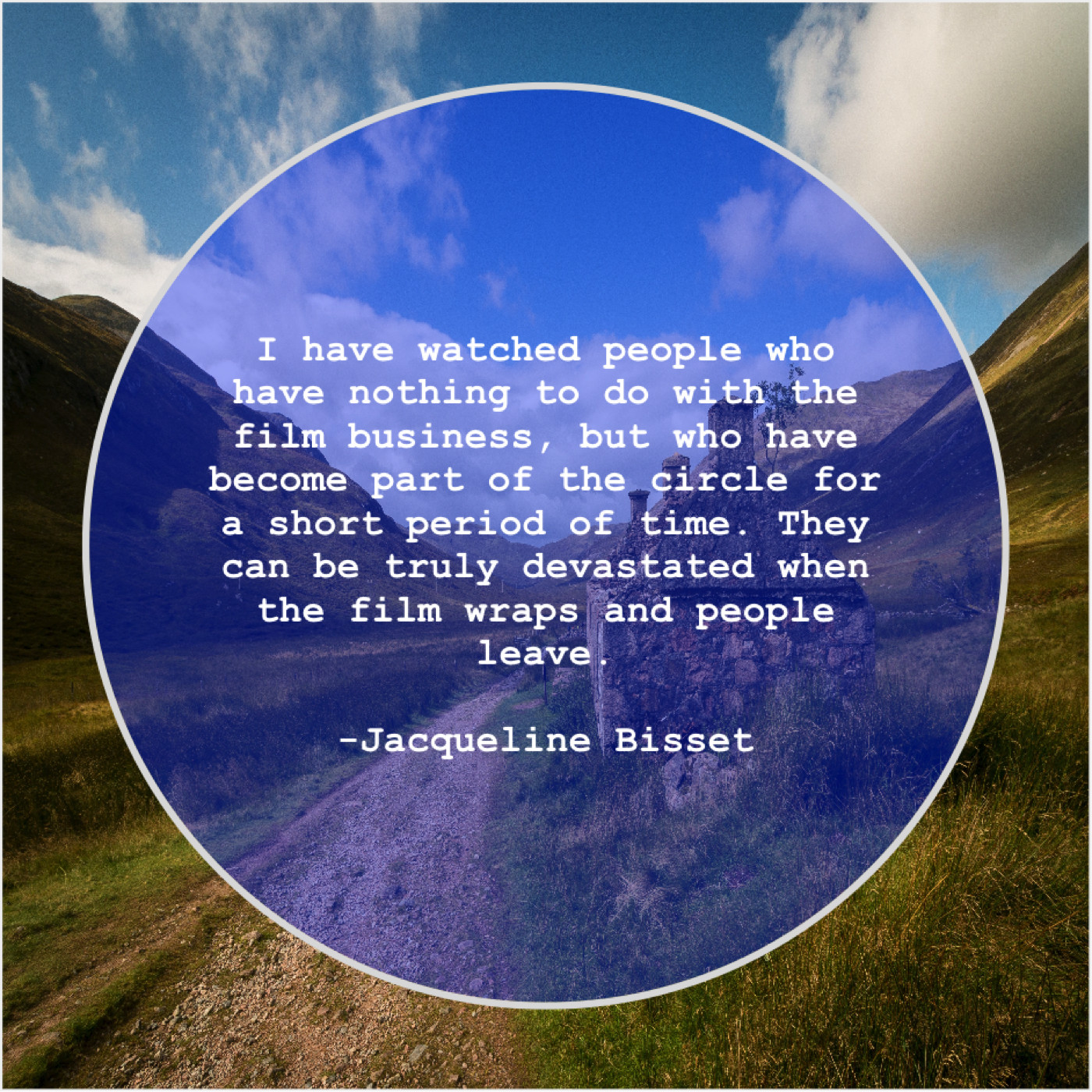 Jacqueline Bisset Jacqueline Bisset – I have watched people who… September 5, 2019 admin “I have watched people who have nothing to do with the film business, but who have become part of the circle for a short period of time. They can be truly devastated when the film wraps and people leave.”-Jacqueline Bisset