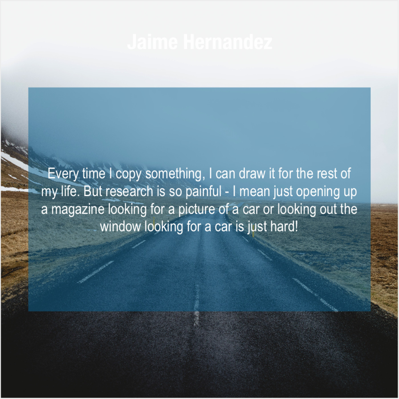 Jaime Hernandez Jaime Hernandez – Every time I copy something… November 24, 2018 admin “Every time I copy something, I can draw it for the rest of my life. But research is so painful – I mean just opening up a magazine looking for a picture of a car or looking out the window looking for a car is just hard!”-Jaime Hernandez