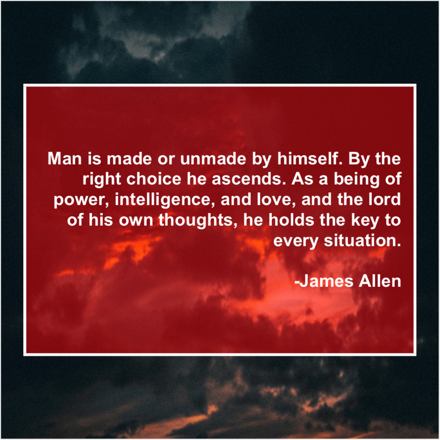 James Allen James Allen – Man is made or unmade… June 18, 2019 admin “Man is made or unmade by himself. By the right choice he ascends. As a being of power, intelligence, and love, and the lord of his own thoughts, he holds the key to every situation.”-James Allen