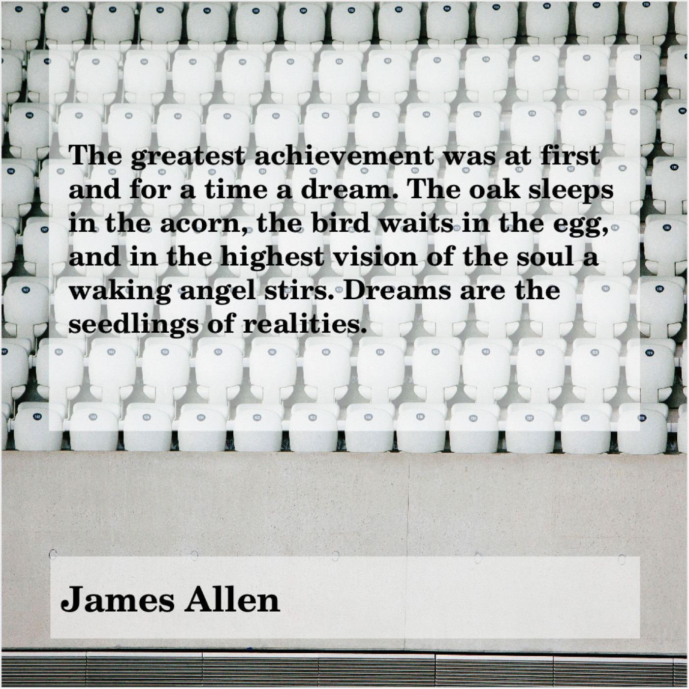 James Allen James Allen – The greatest achievement was at… December 26, 2018 admin “The greatest achievement was at first and for a time a dream. The oak sleeps in the acorn, the bird waits in the egg, and in the highest vision of the soul a waking angel stirs. Dreams are the seedlings of realities.”-James Allen