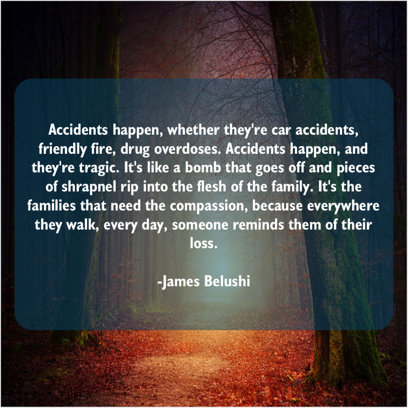 “Accidents happen, whether they’re car accidents, friendly fire, drug overdoses. Accidents happen, and they’re tragic. It’s like a bomb that goes off and pieces of shrapnel rip into the flesh of the family. It’s the families that need the compassion, because everywhere they walk, every day, someone reminds them of their loss.”