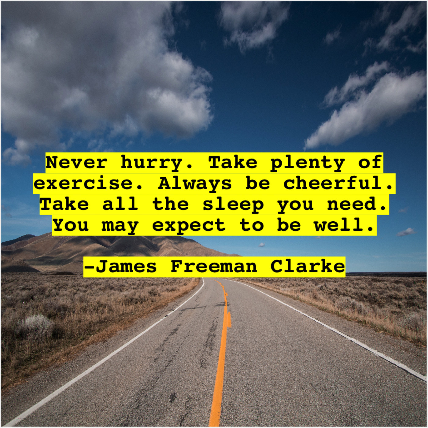 James Freeman Clarke James Freeman Clarke – Never hurry. Take plenty of… December 18, 2018 admin “Never hurry. Take plenty of exercise. Always be cheerful. Take all the sleep you need. You may expect to be well.”-James Freeman Clarke