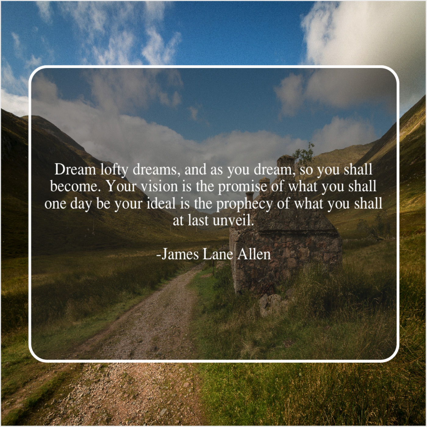 James Lane Allen James Lane Allen – Dream lofty dreams, and as… October 31, 2018 admin “Dream lofty dreams, and as you dream, so you shall become. Your vision is the promise of what you shall one day be your ideal is the prophecy of what you shall at last unveil.”-James Lane Allen