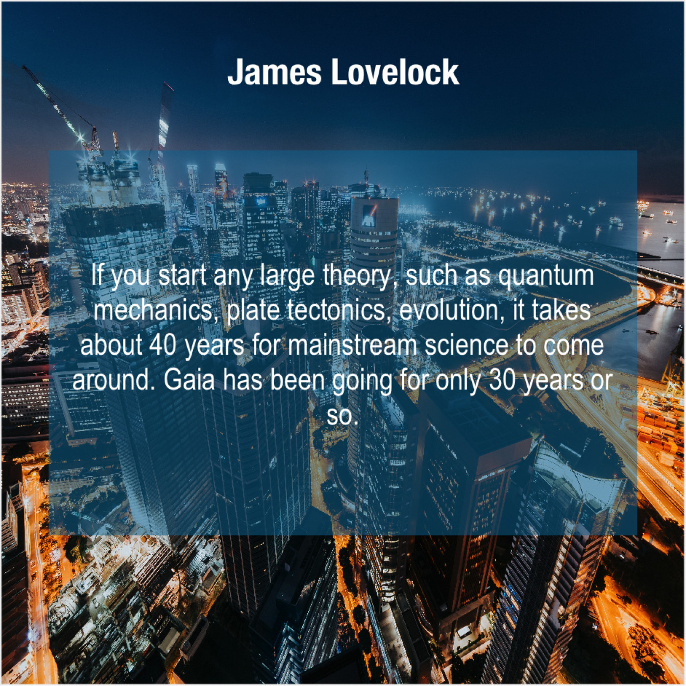 James Lovelock James Lovelock – If you start any large… May 18, 2019 admin “If you start any large theory, such as quantum mechanics, plate tectonics, evolution, it takes about 40 years for mainstream science to come around. Gaia has been going for only 30 years or so.”-James Lovelock