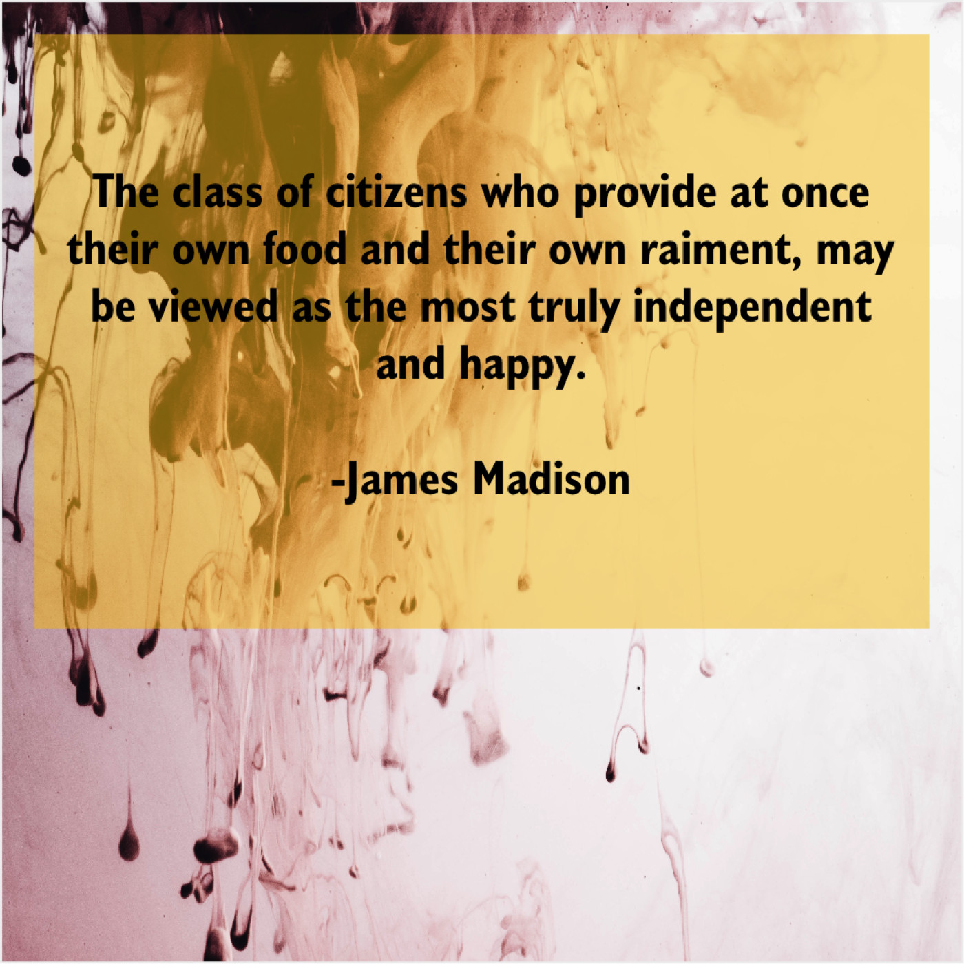 James Madison James Madison – The class of citizens who… September 3, 2019 admin “The class of citizens who provide at once their own food and their own raiment, may be viewed as the most truly independent and happy.”-James Madison