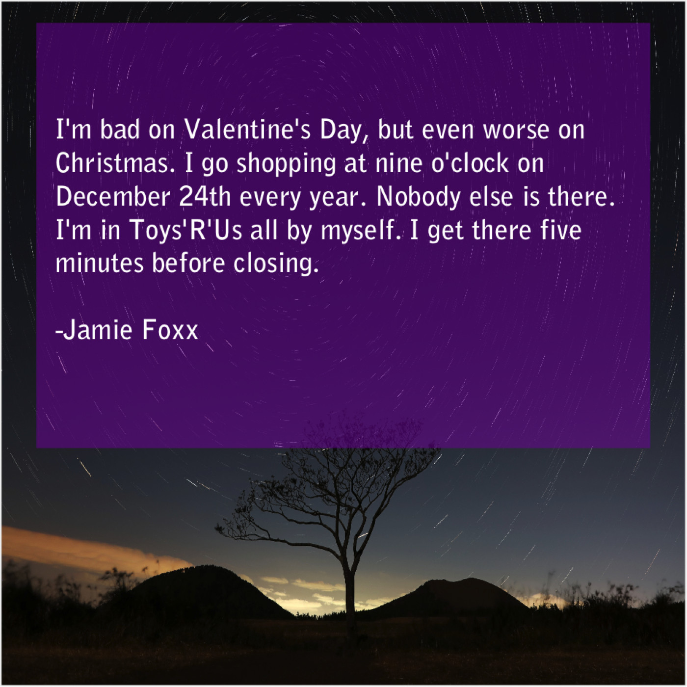 Jamie Foxx Jamie Foxx – I’m bad on Valentine’s Day… December 21, 2018 admin “I’m bad on Valentine’s Day, but even worse on Christmas. I go shopping at nine o’clock on December 24th every year. Nobody else is there. I’m in Toys’R’Us all by myself. I get there five minutes before closing.”-Jamie Foxx