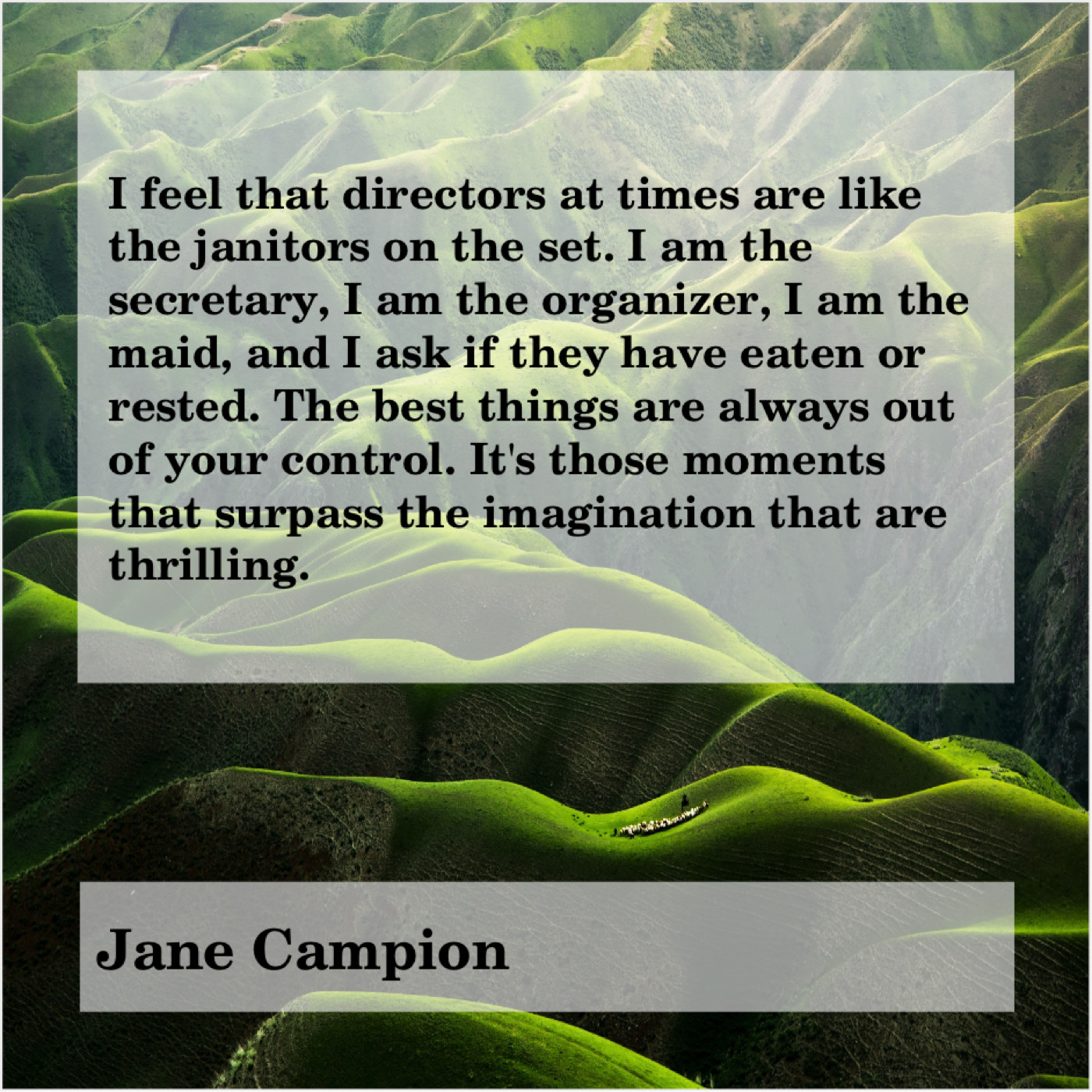 “I feel that directors at times are like the janitors on the set. I am the secretary, I am the organizer, I am the maid, and I ask if they have eaten or rested. The best things are always out of your control. It’s those moments that surpass the imagination that are thrilling.”