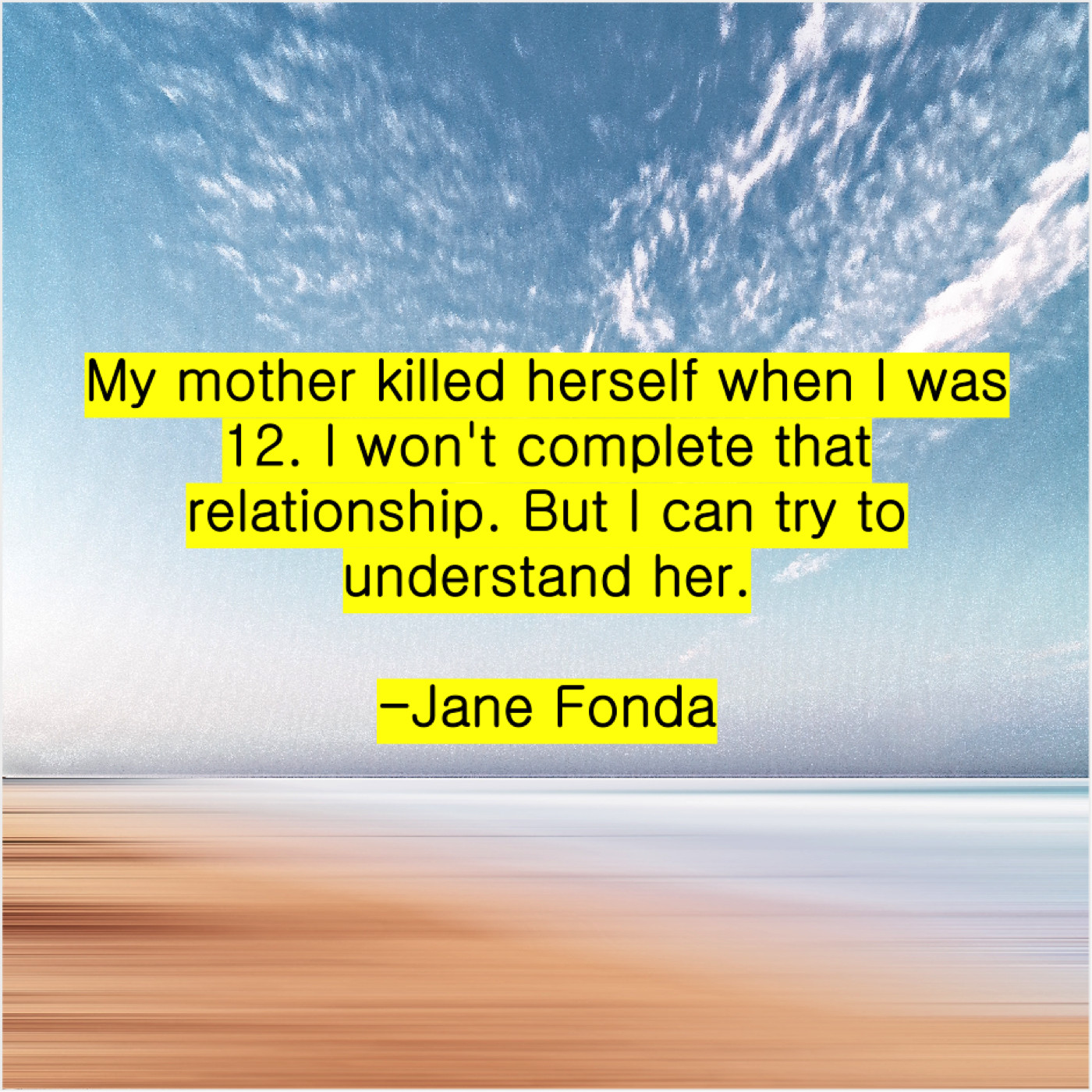 Jane Fonda Jane Fonda – My mother killed herself when… April 27, 2019 admin “My mother killed herself when I was 12. I won’t complete that relationship. But I can try to understand her.”-Jane Fonda