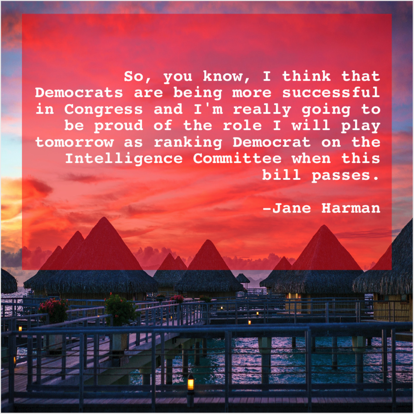 Jane Harman Jane Harman – So, you know, I think… January 9, 2019 admin “So, you know, I think that Democrats are being more successful in Congress and I’m really going to be proud of the role I will play tomorrow as ranking Democrat on the Intelligence Committee when this bill passes.”-Jane Harman