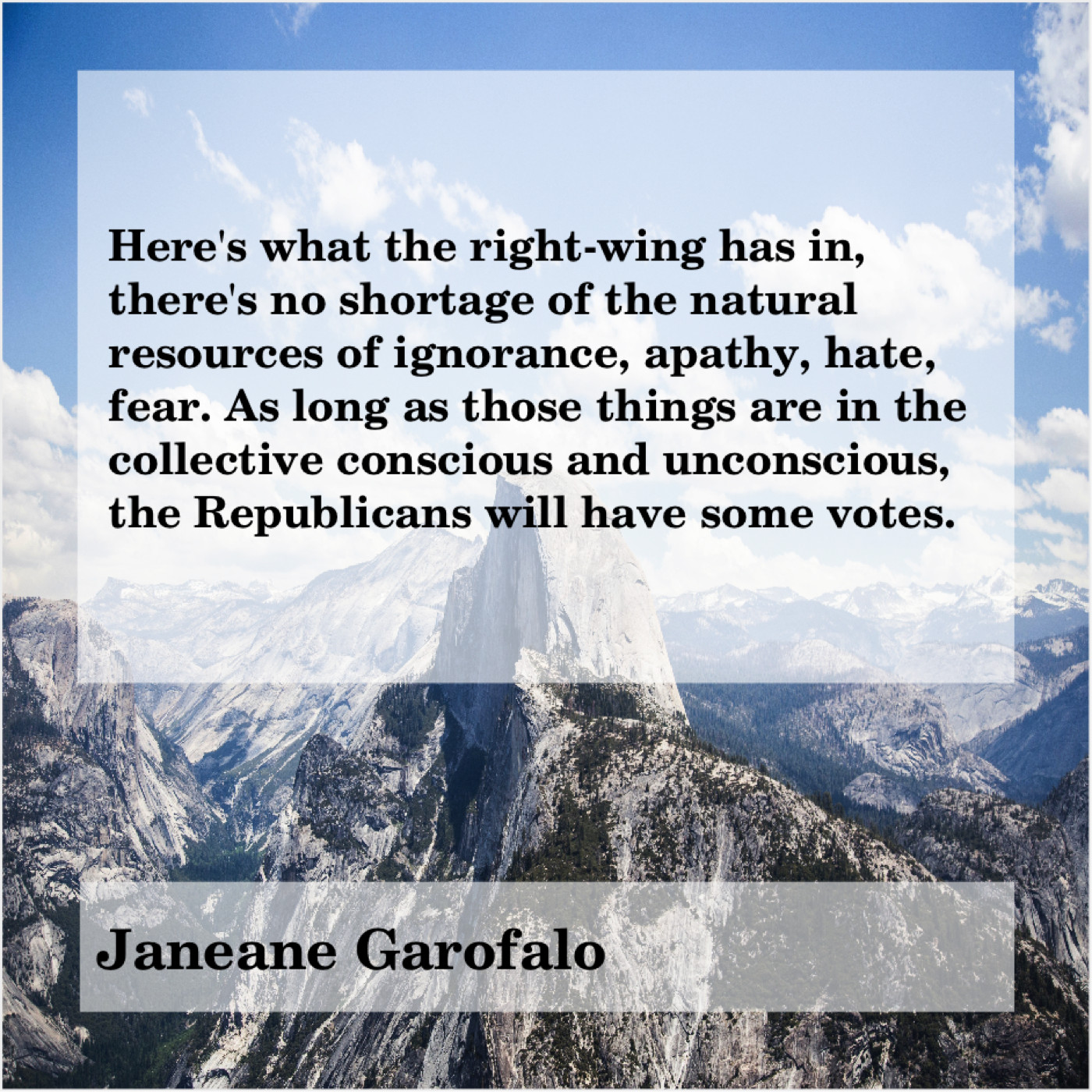 Janeane Garofalo Janeane Garofalo – Here’s what the right-wing… May 22, 2019 admin “Here’s what the right-wing has in, there’s no shortage of the natural resources of ignorance, apathy, hate, fear. As long as those things are in the collective conscious and unconscious, the Republicans will have some votes.”-Janeane Garofalo