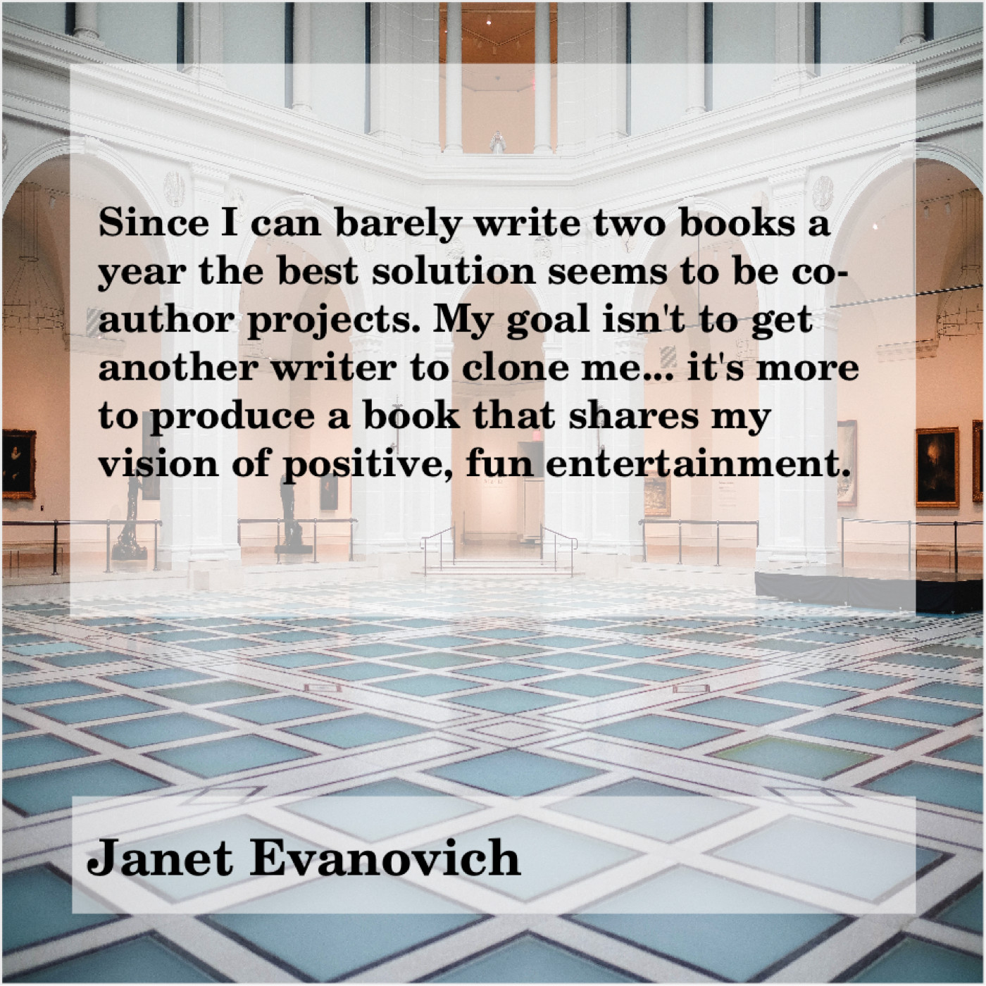 Janet Evanovich Janet Evanovich – Since I can barely write… November 28, 2018 admin “Since I can barely write two books a year the best solution seems to be co-author projects. My goal isn’t to get another writer to clone me… it’s more to produce a book that shares my vision of positive, fun entertainment.”-Janet Evanovich