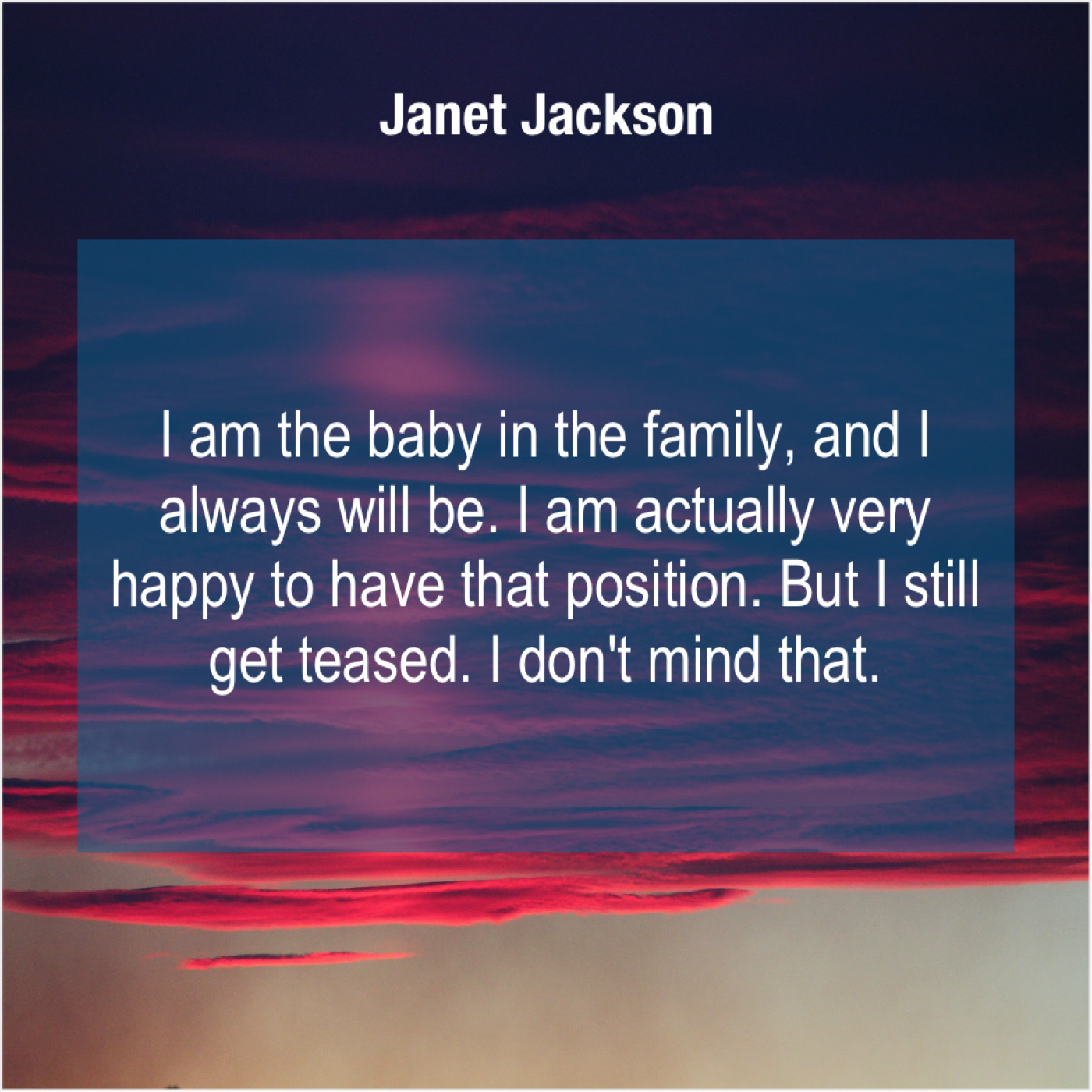 Janet Jackson Janet Jackson – I am the baby in… August 2, 2019 admin “I am the baby in the family, and I always will be. I am actually very happy to have that position. But I still get teased. I don’t mind that.”-Janet Jackson