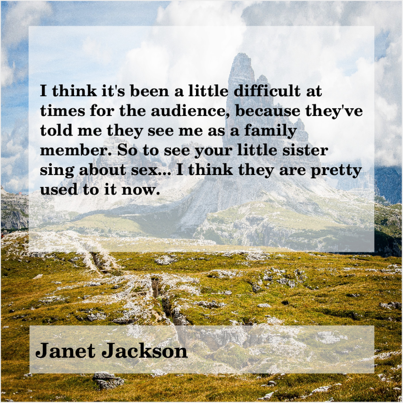 Janet Jackson Janet Jackson – I think it’s been a… April 4, 2019 admin “I think it’s been a little difficult at times for the audience, because they’ve told me they see me as a family member. So to see your little sister sing about sex… I think they are pretty used to it now.”-Janet Jackson
