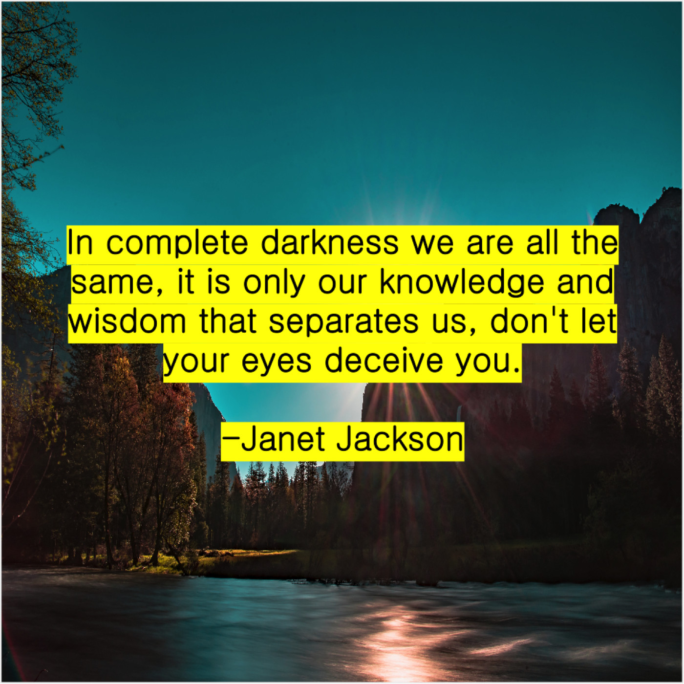 Janet Jackson Janet Jackson – In complete darkness we are… May 9, 2019 admin “In complete darkness we are all the same, it is only our knowledge and wisdom that separates us, don’t let your eyes deceive you.”-Janet Jackson