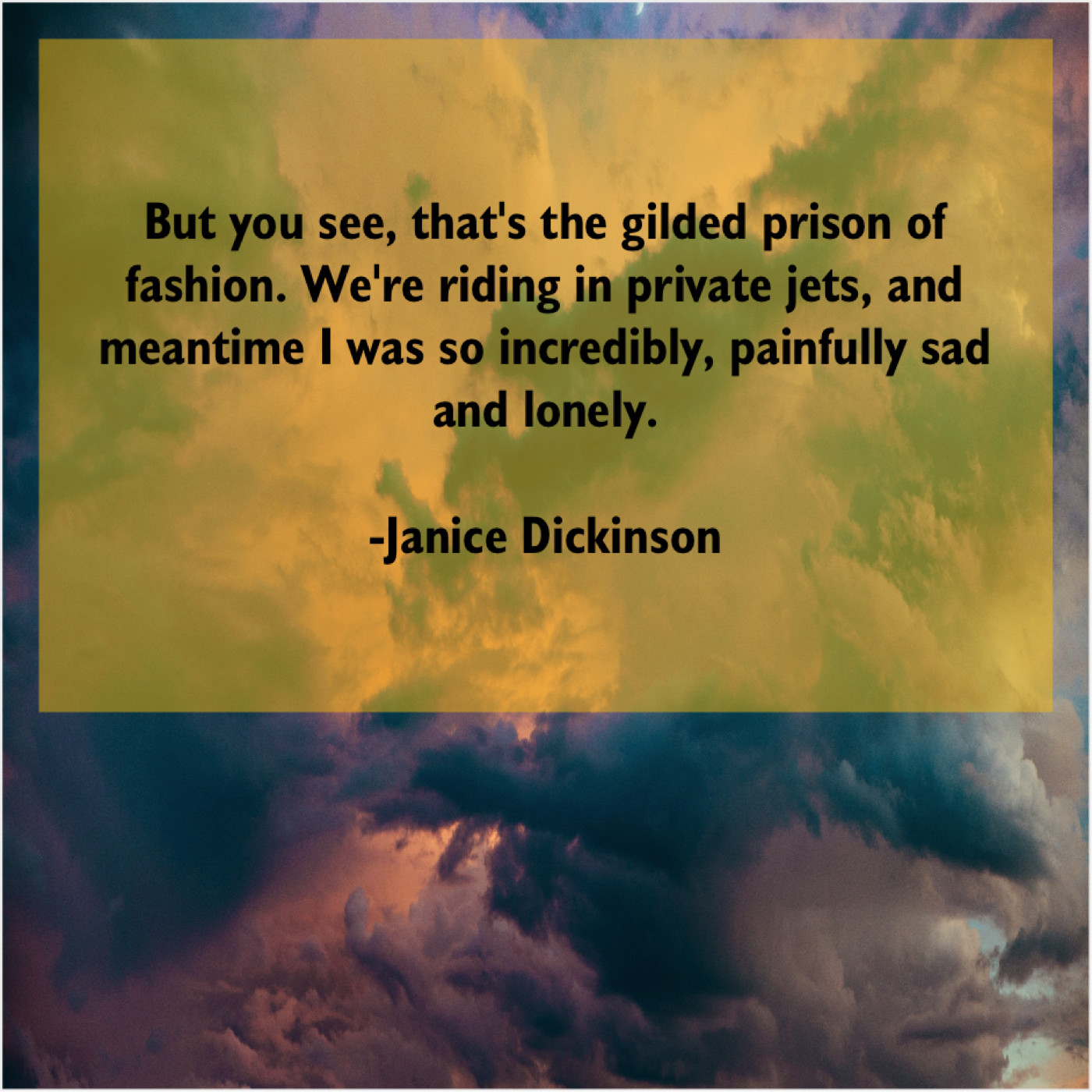 Janice Dickinson Janice Dickinson – But you see, that’s the… April 29, 2019 admin “But you see, that’s the gilded prison of fashion. We’re riding in private jets, and meantime I was so incredibly, painfully sad and lonely.”-Janice Dickinson